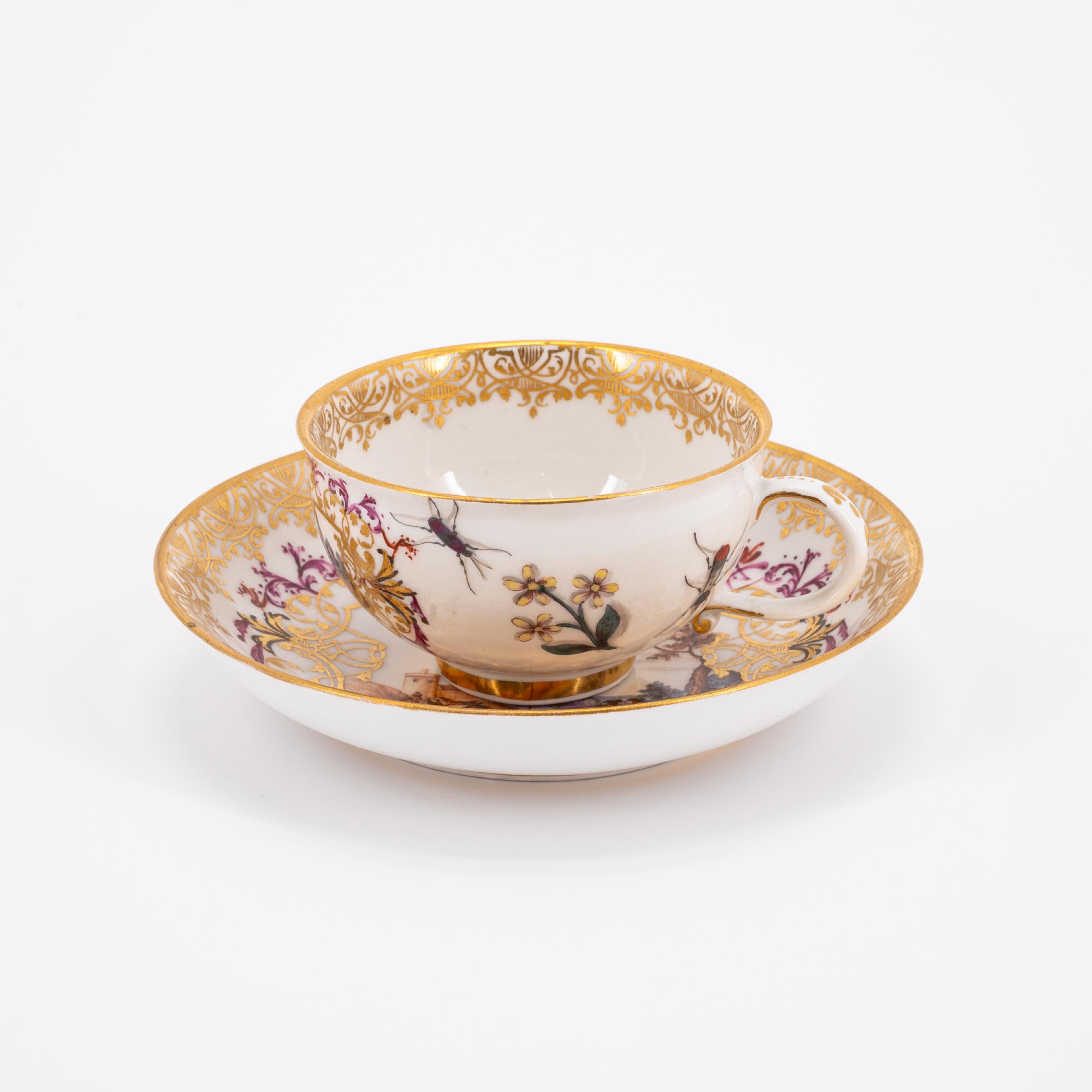 TASSE UND UNTERTASSE MIT GROßEN GOLDKARTUSCHEN UND JAGDSZENEN.