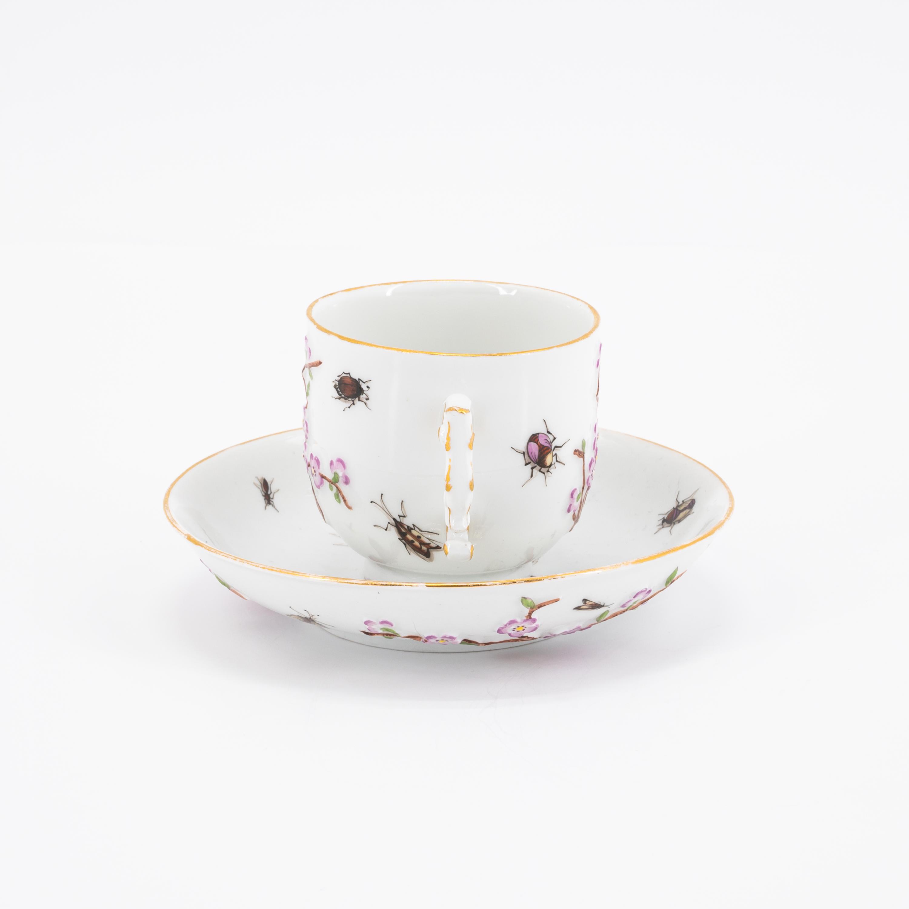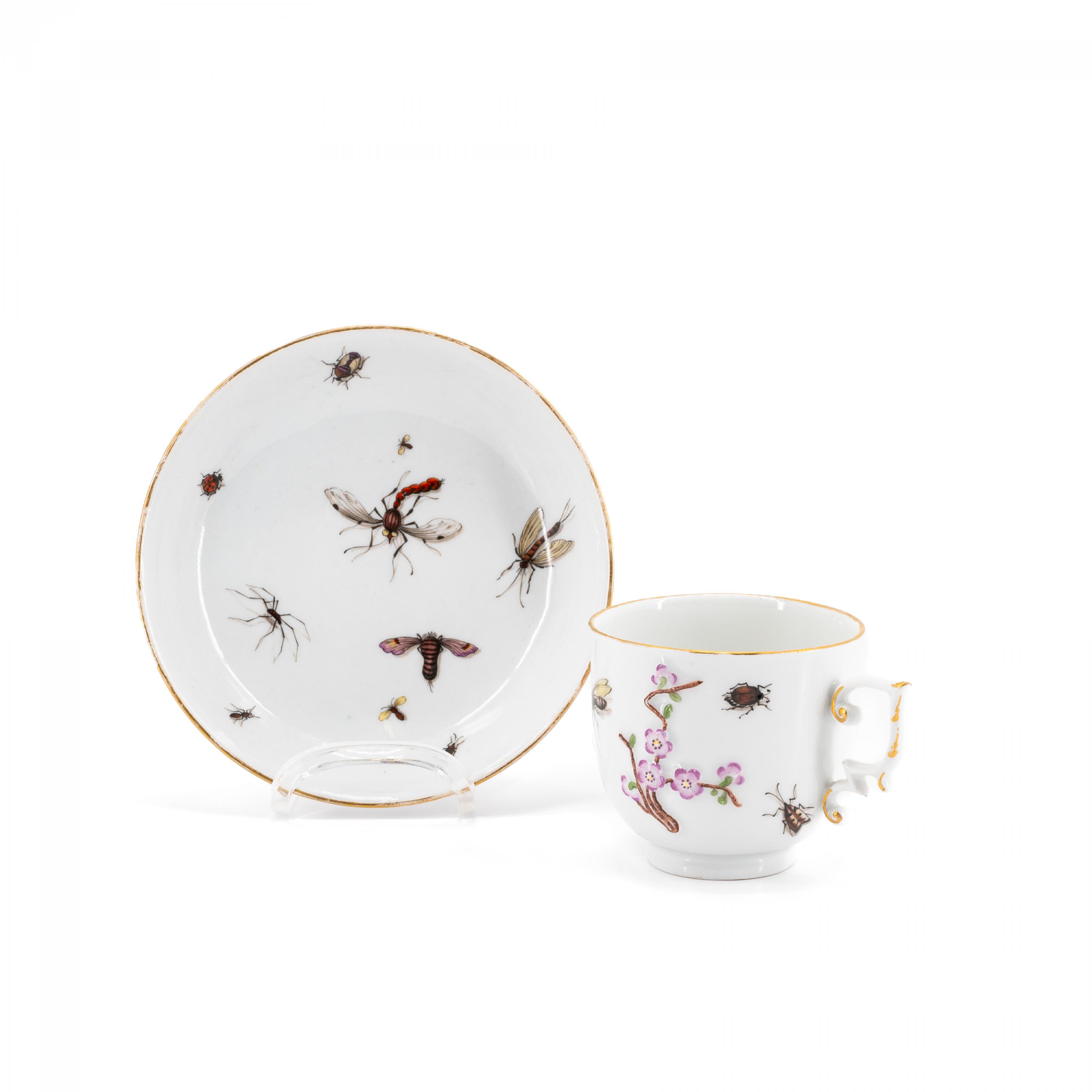 TASSE UND UNTERTASSE MIT RELIFIERTEN BLUMEN UND INSEKTENMALEREIEN.