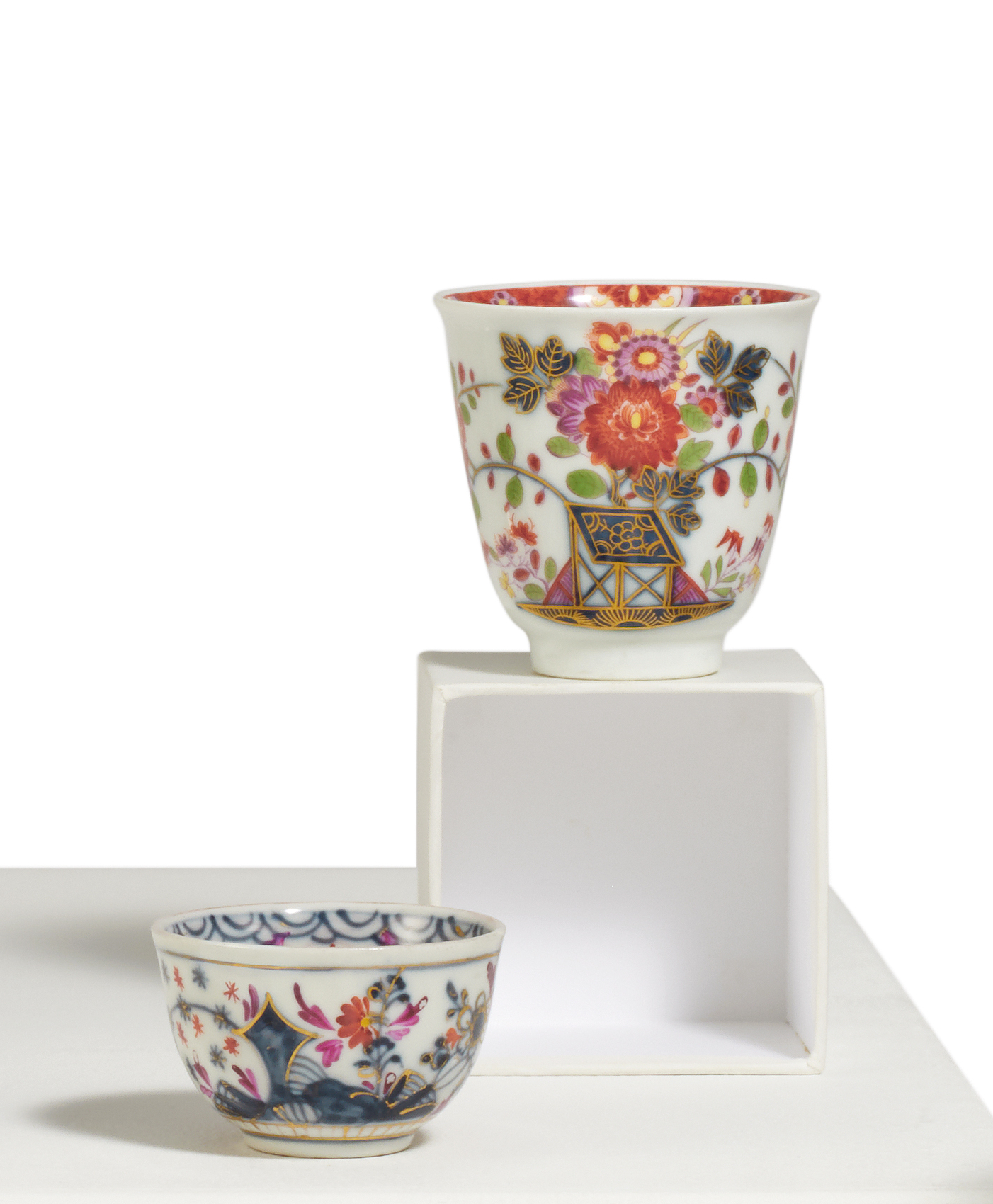 TEEBECHER MIT TISCHCHENDEKOR UND KOPPCHEN MIT KAKIEMONDEKOR.