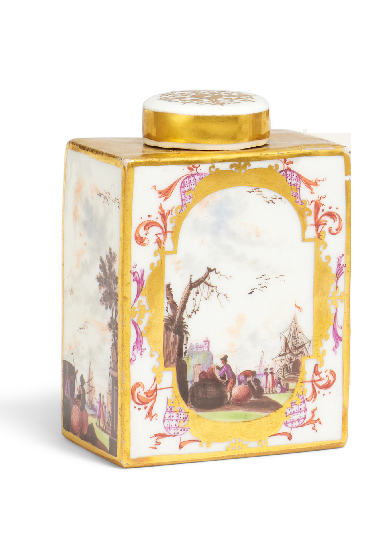 Beschreibung: Rechteckige Teedose mit rundem Deckel. Auf den Breitseiten jeweils eine Kartusche mit