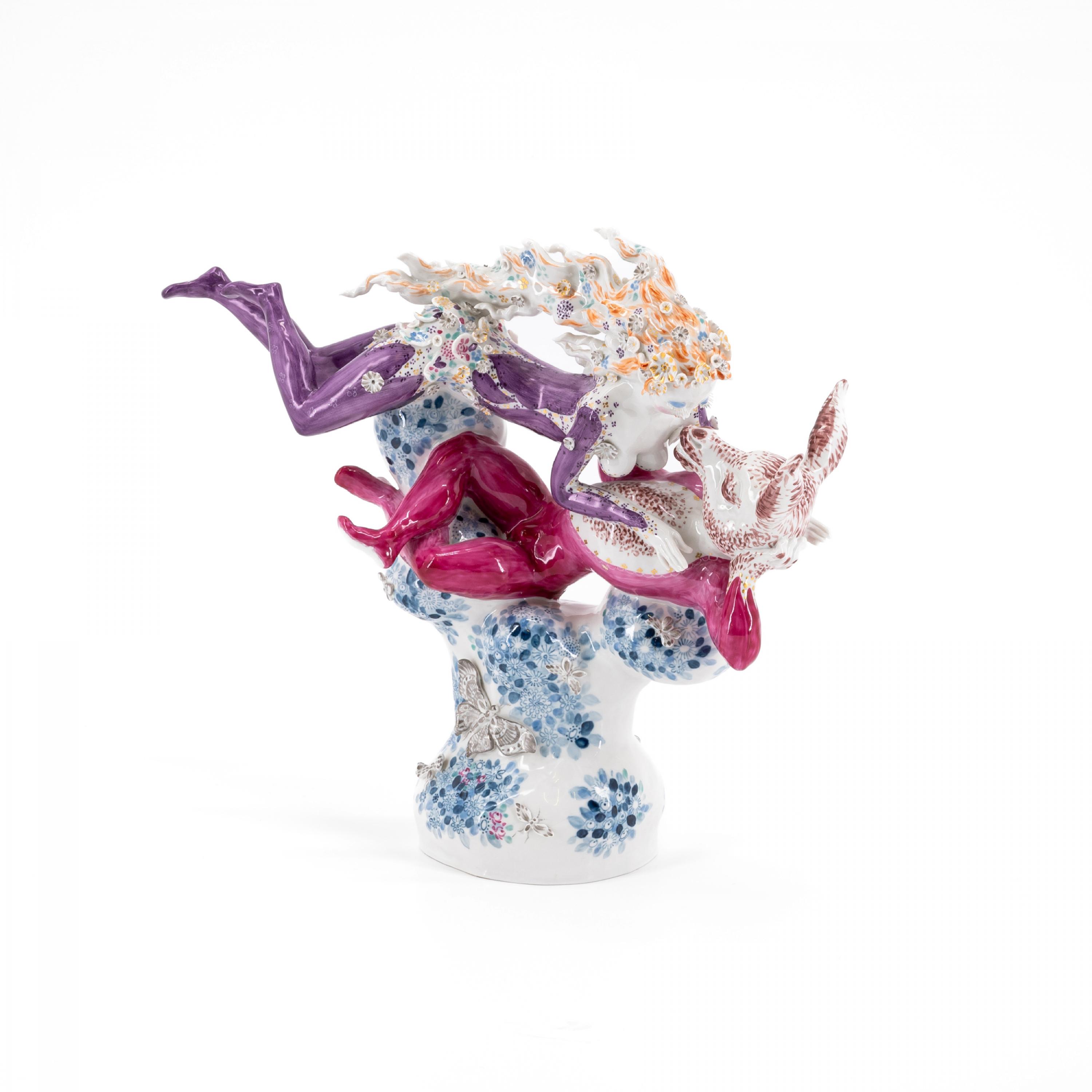 Beschreibung: Auf einem organisch-geformtem Sockel, mit blau-staffierten Blumen und aufgelegten