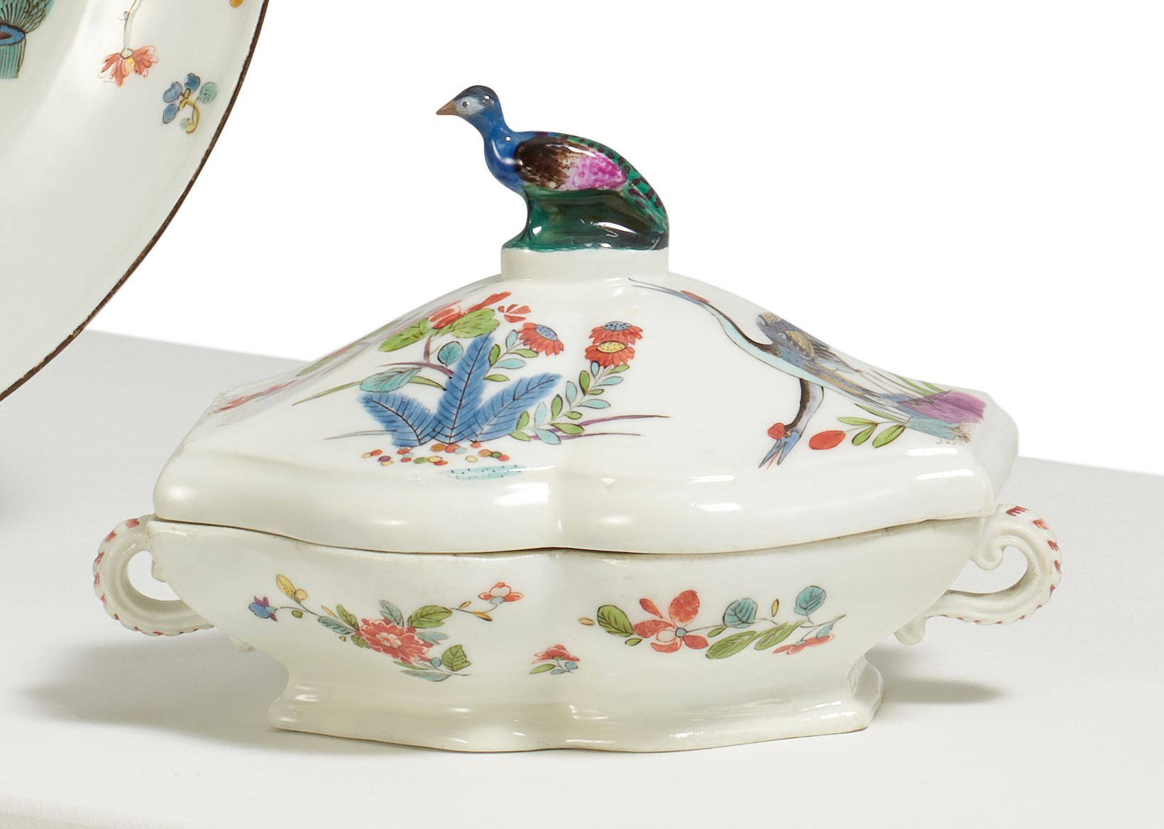 Das Dekor basiert auf einer chinesischen Vorlage von "famille verte" Geschirren aus der Sammlung August des Starken. Es wurden immer wieder einzelne Dekorelemente wie die beiden Kraniche und der fliegende Vogel kombiniert.