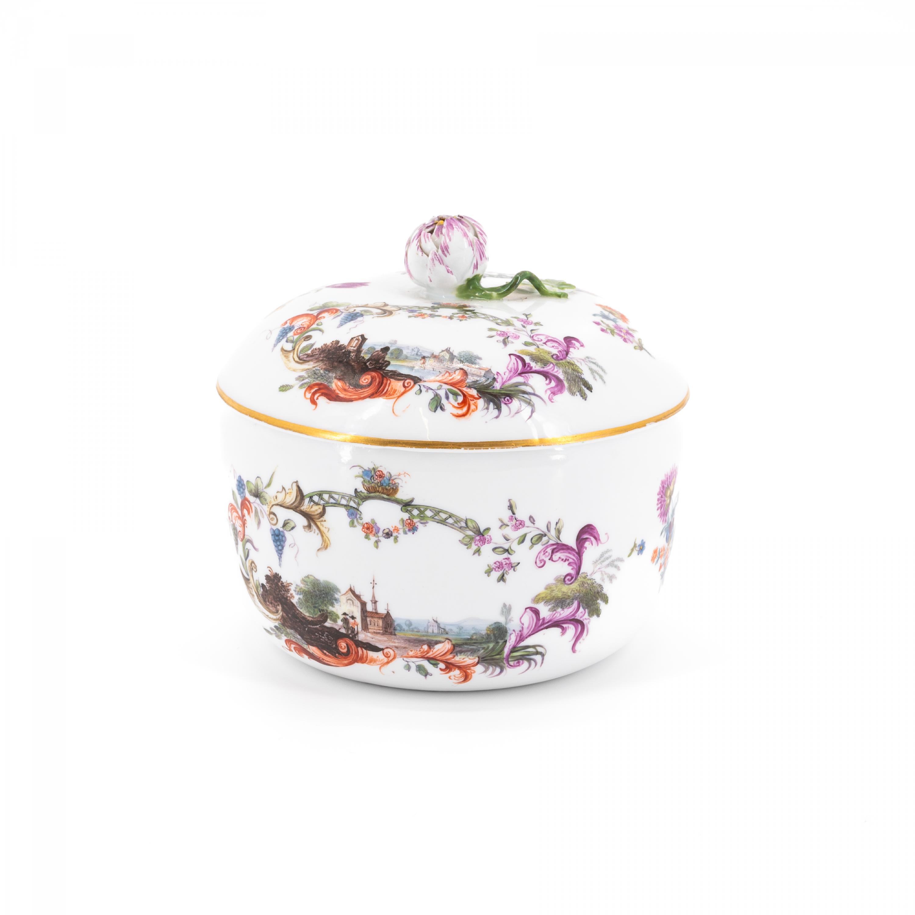 ZUCKERDOSE MIT LANDSCHAFTSKARTUSCHEN UND AUFGELEGTEN BLÜTEN.