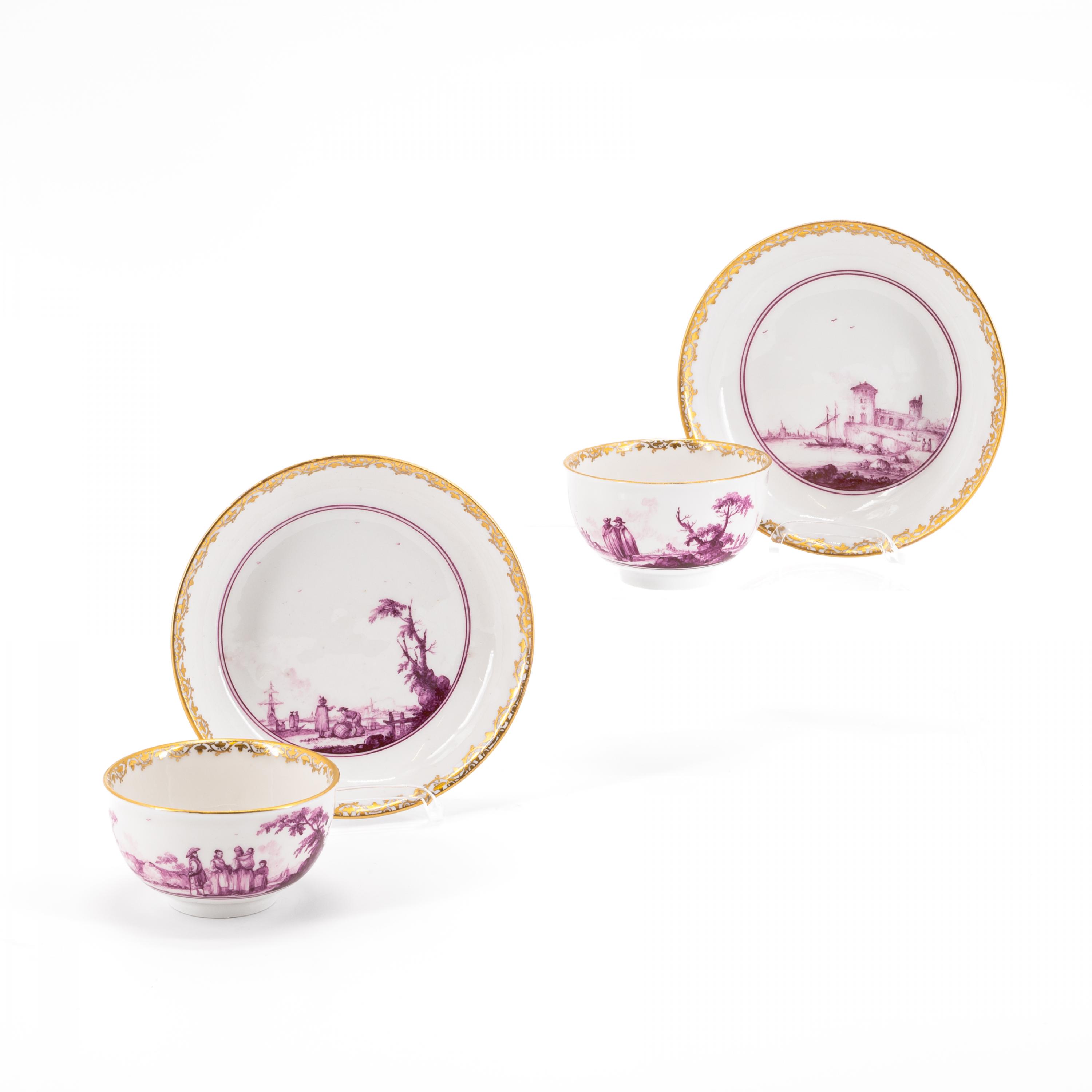 Technik: Porzellan, purpurfarben staffiert, Gold akzentuiert.