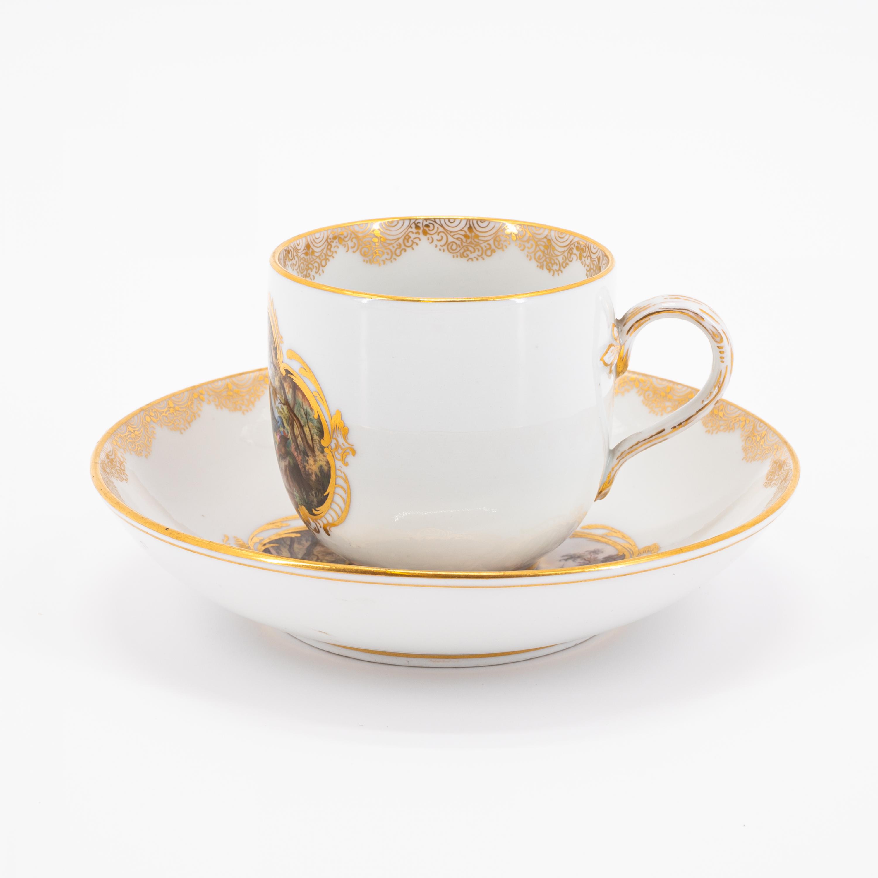 ZWEI TASSEN UND UNTERTASSEN MIT FEINEN GENRESZENEN.