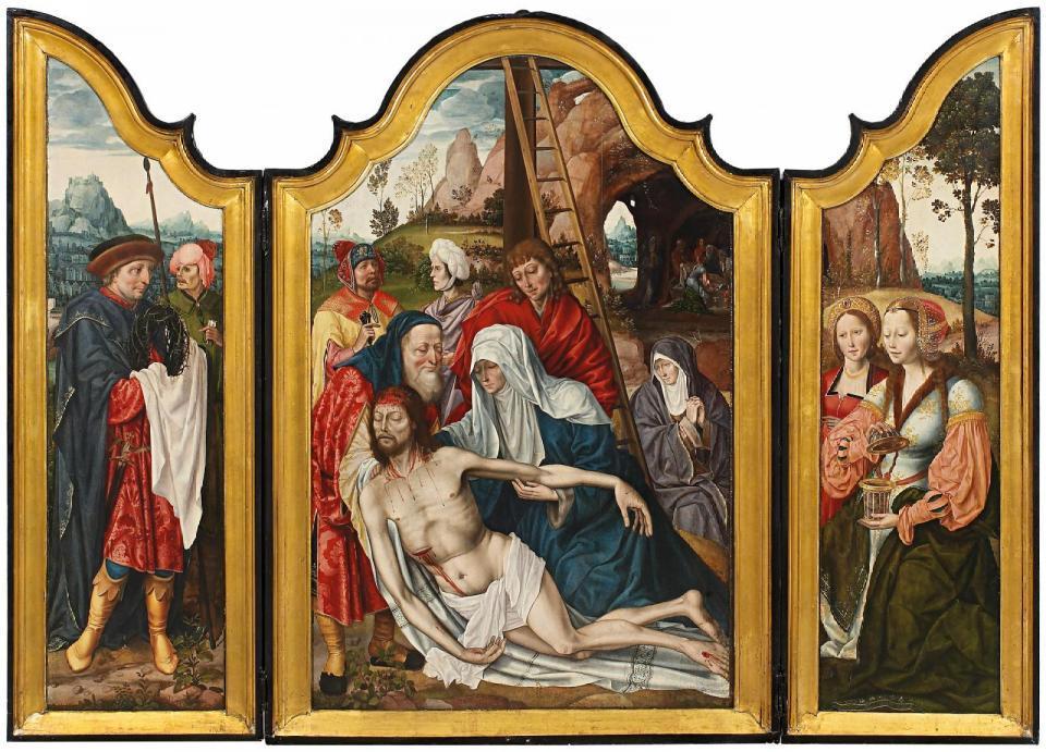 Großes Altartriptychon mit der Beweinung Christi. Mitteltafel: Die Wehklage Linker Flügel: Der Stifter mit Marterwerkzeug Rechter Flügel: