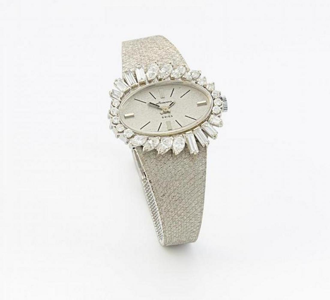 Handaufzug (defekt). 585/- Weißgold-Armband, Zffbl. silbern, Indizes silbern/schwarz. Gewicht: 46,6g. L.ca. 19,0cm, D.ca. 1,5 x 2,5cm. Lünette mit Diamant-Baguettes und -Navettes verziert. (A) D (W) 28 (Z) 4 (G) 4