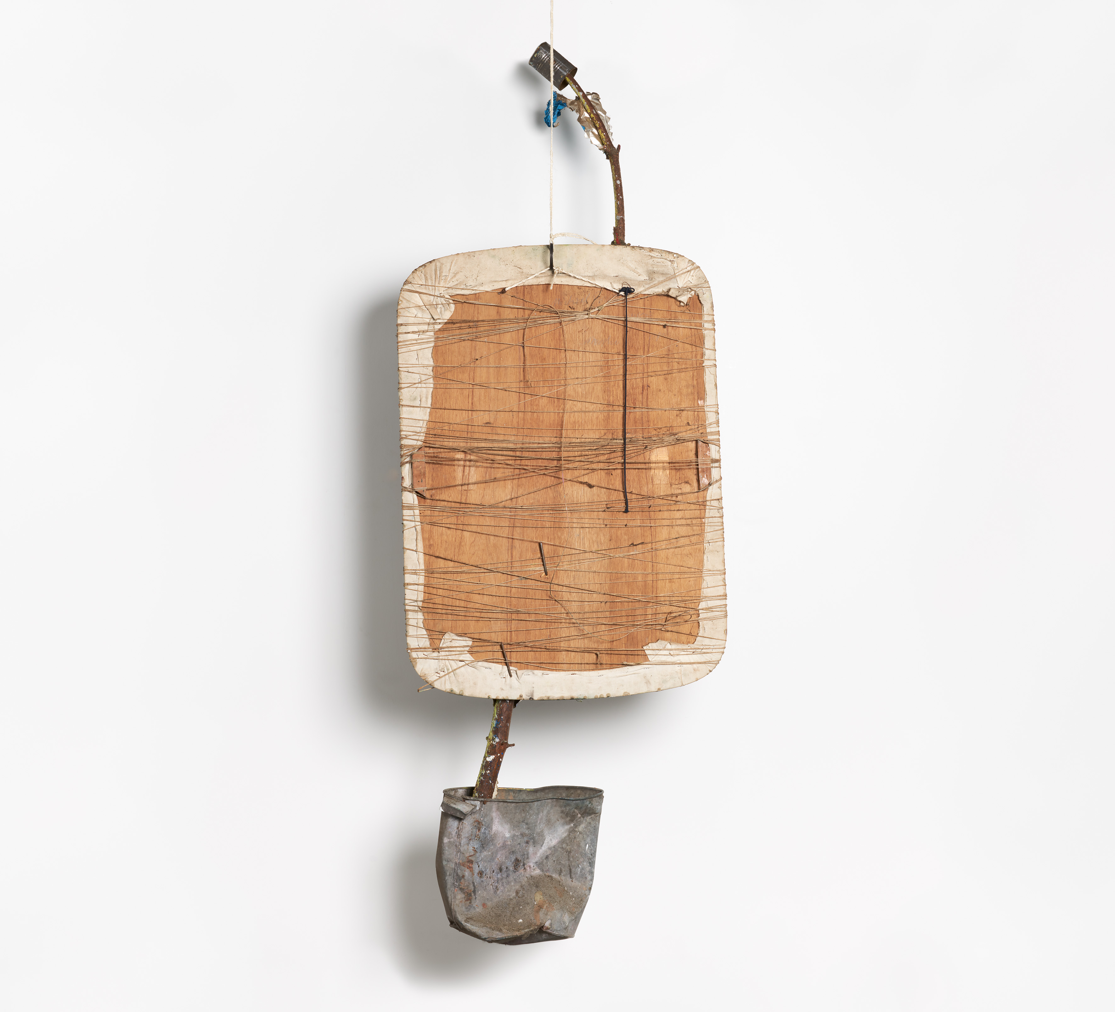 Technik: Assemblage aus verschiedenen Materialien, u.a. Holz, Metall, Textilien und Farbe.