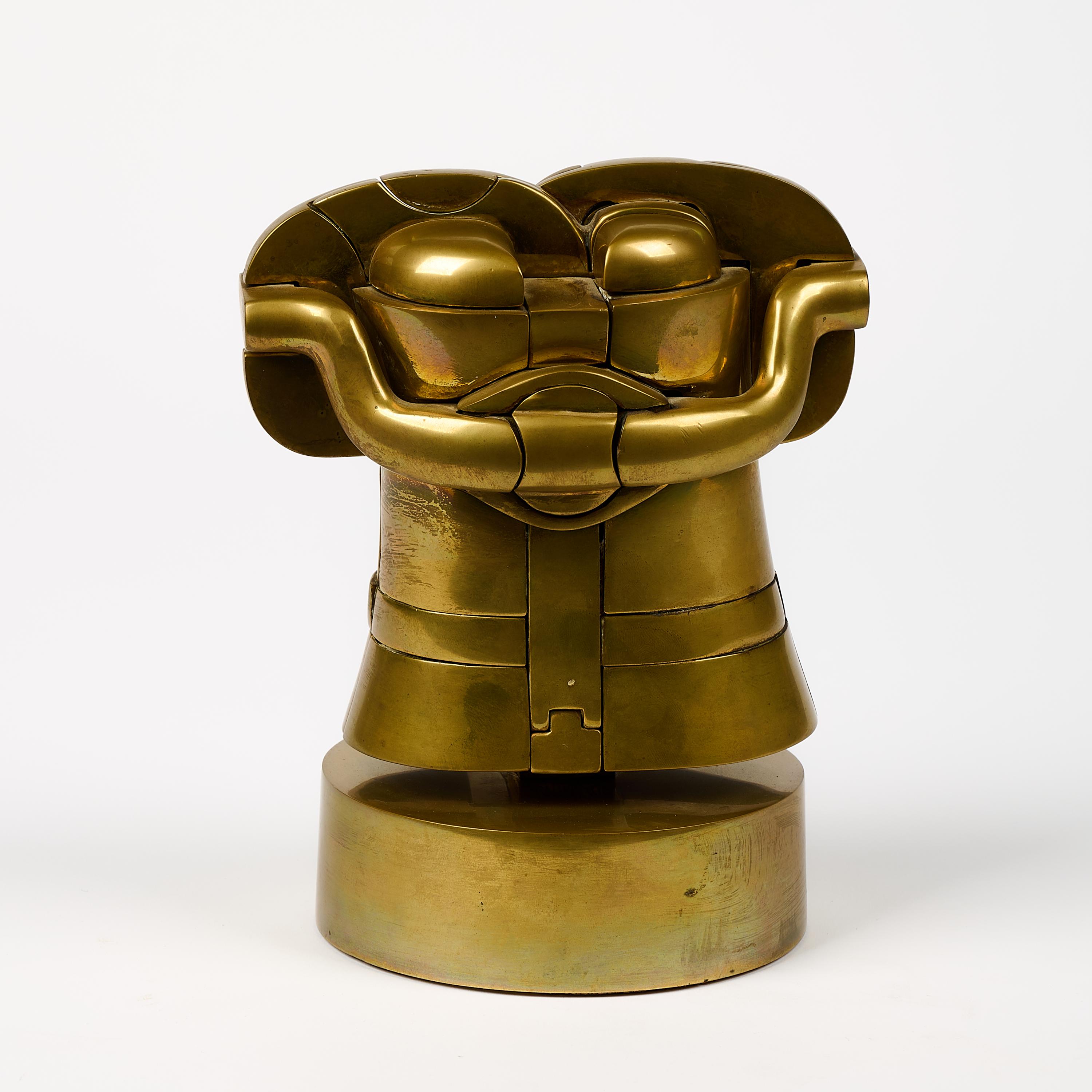 Messing partiell leicht angelaufen. Vereinzelt leichte Bestoßungen an den Kanten oben. Vereinzelt minimale weißliche Rückstände (von Putzmittel?) in den Vertiefungen. Punktuell minimale Korrosion, z.B. vorne links und am Sockel. Ansonsten guter Zustand.