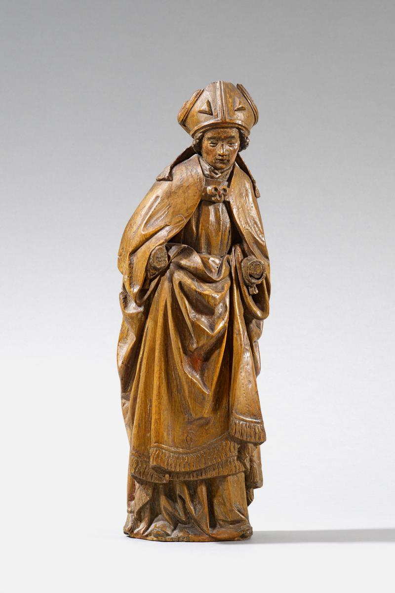 Heiliger Bischof, verm. aus einem Altarretabel stammend. Standfigur. Fassung nur noch in Resten vorhanden. Hände verloren. Holz. Höhe: 41cm.
