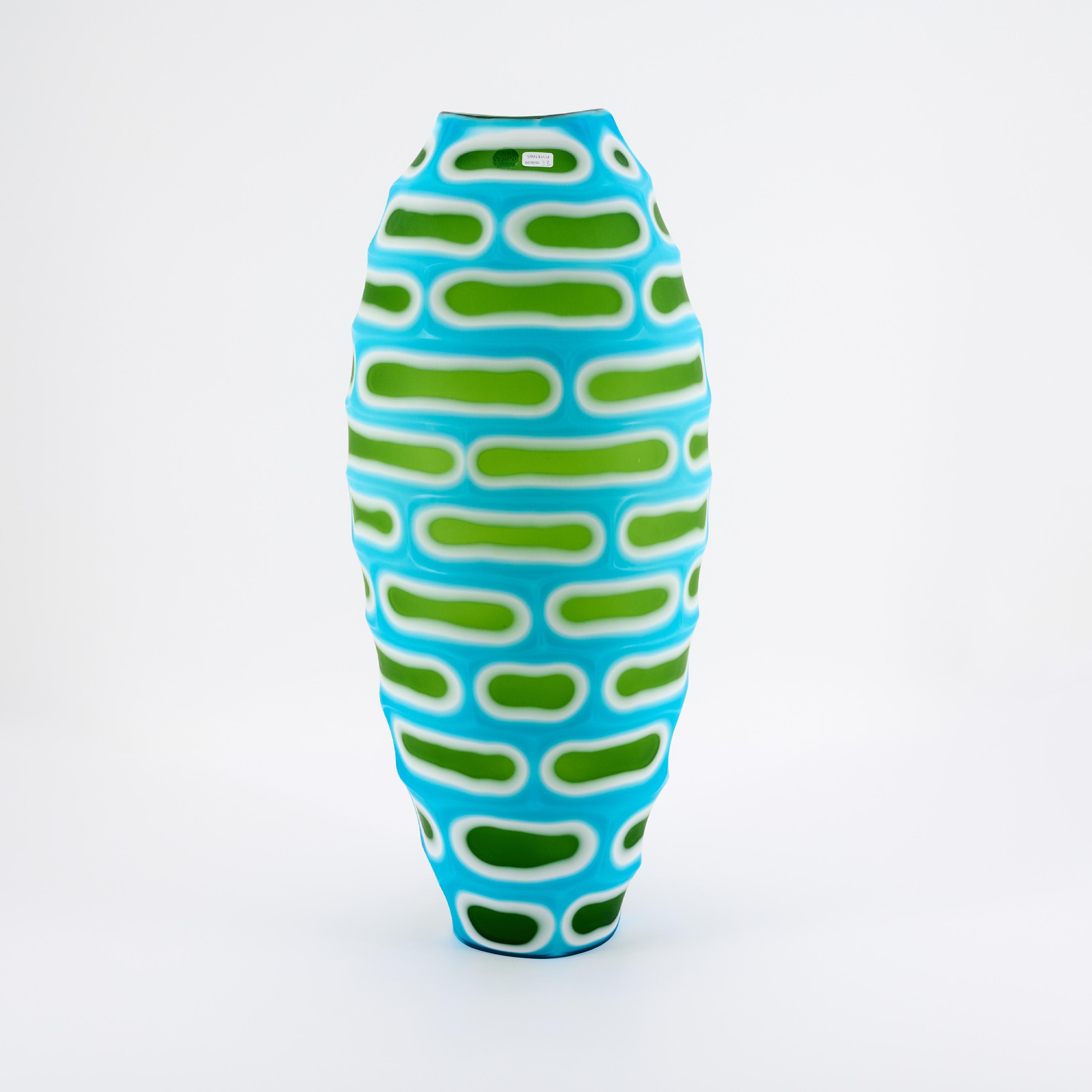Technik: Farbloses Überfangglas, apfelgrün unterfangen, hellblau überfangen, opak weiße Zwischenschicht, flächendeckender Schliffdekor, mattierte Oberfläche.