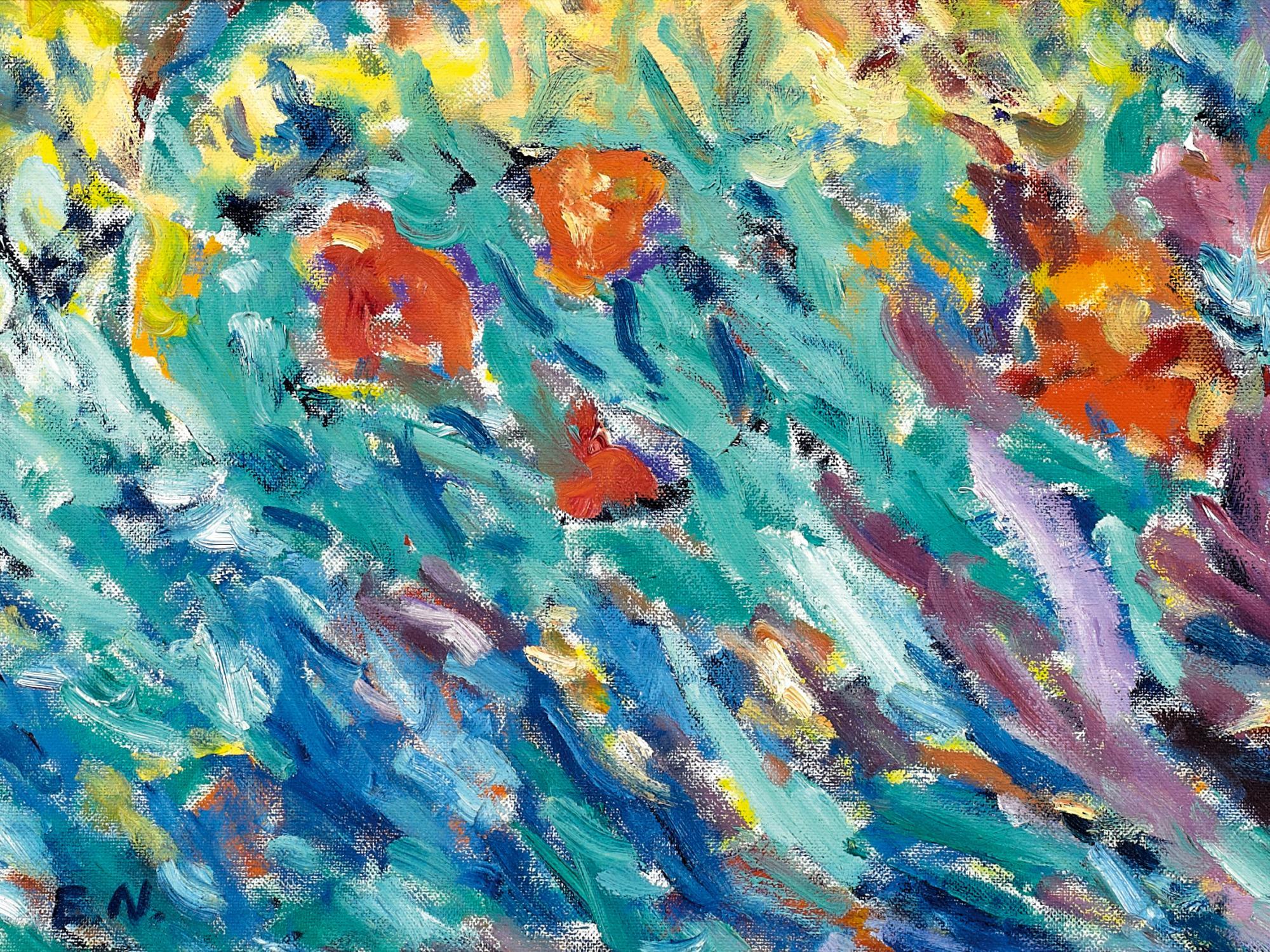 Blumenwiese. Unten links: E.N. Öl auf Leinwand. Auf Karton gezogen. 29 x 38,5cm. Rahmen.