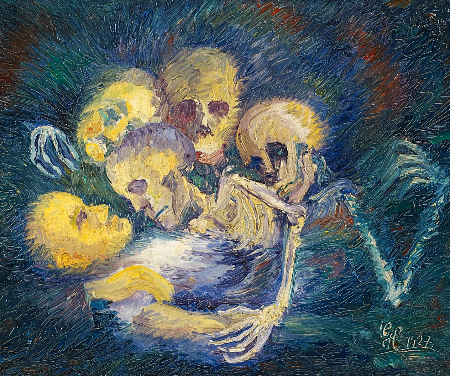 Sterbeszene. Unten rechts: GH (?, ligiert) 1927. Öl auf Karton. 46 x 37,5cm. Rahmen.