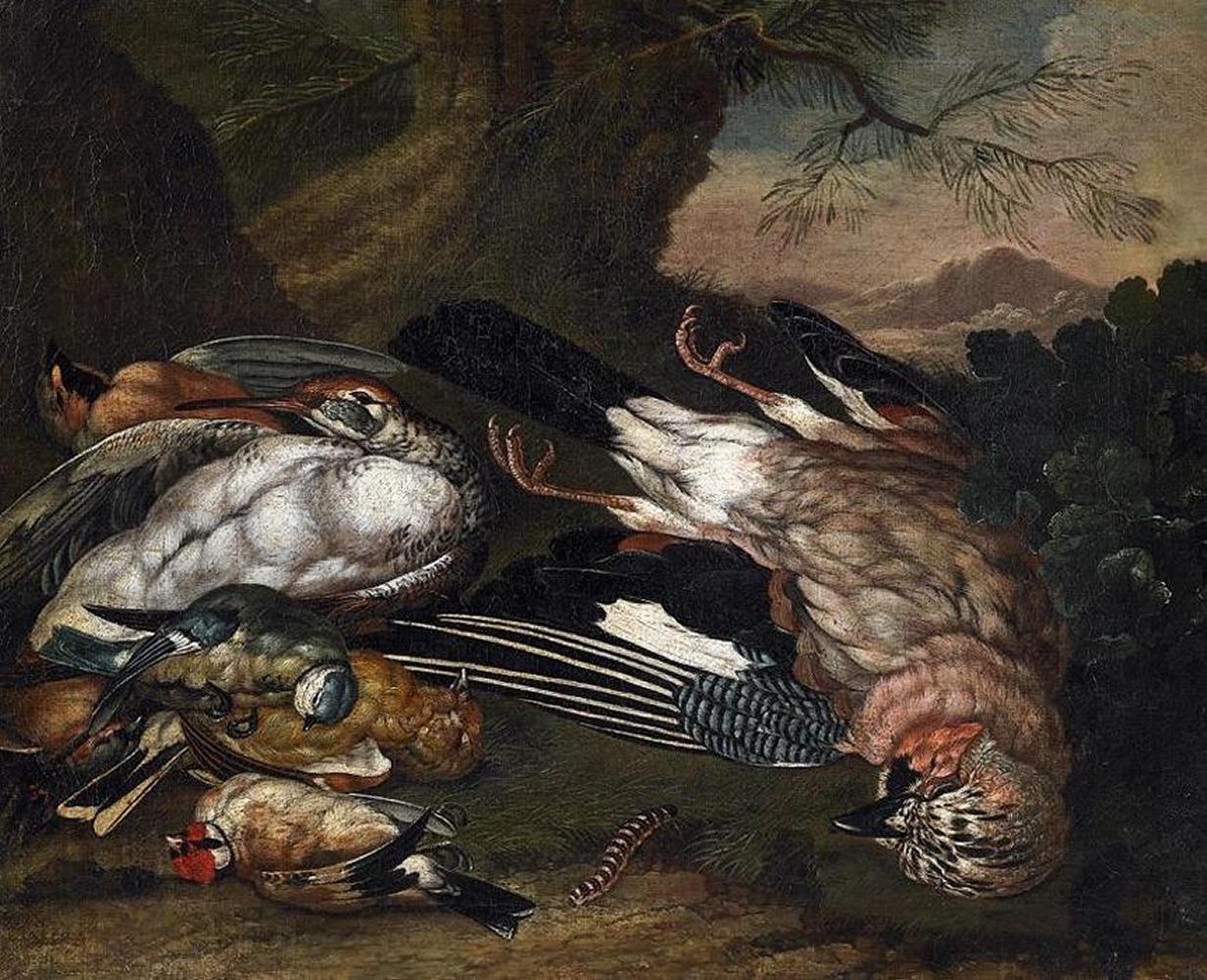 1 Gemälde. Monogrammist W.W. (unten links). Stillleben mit Singvögeln.