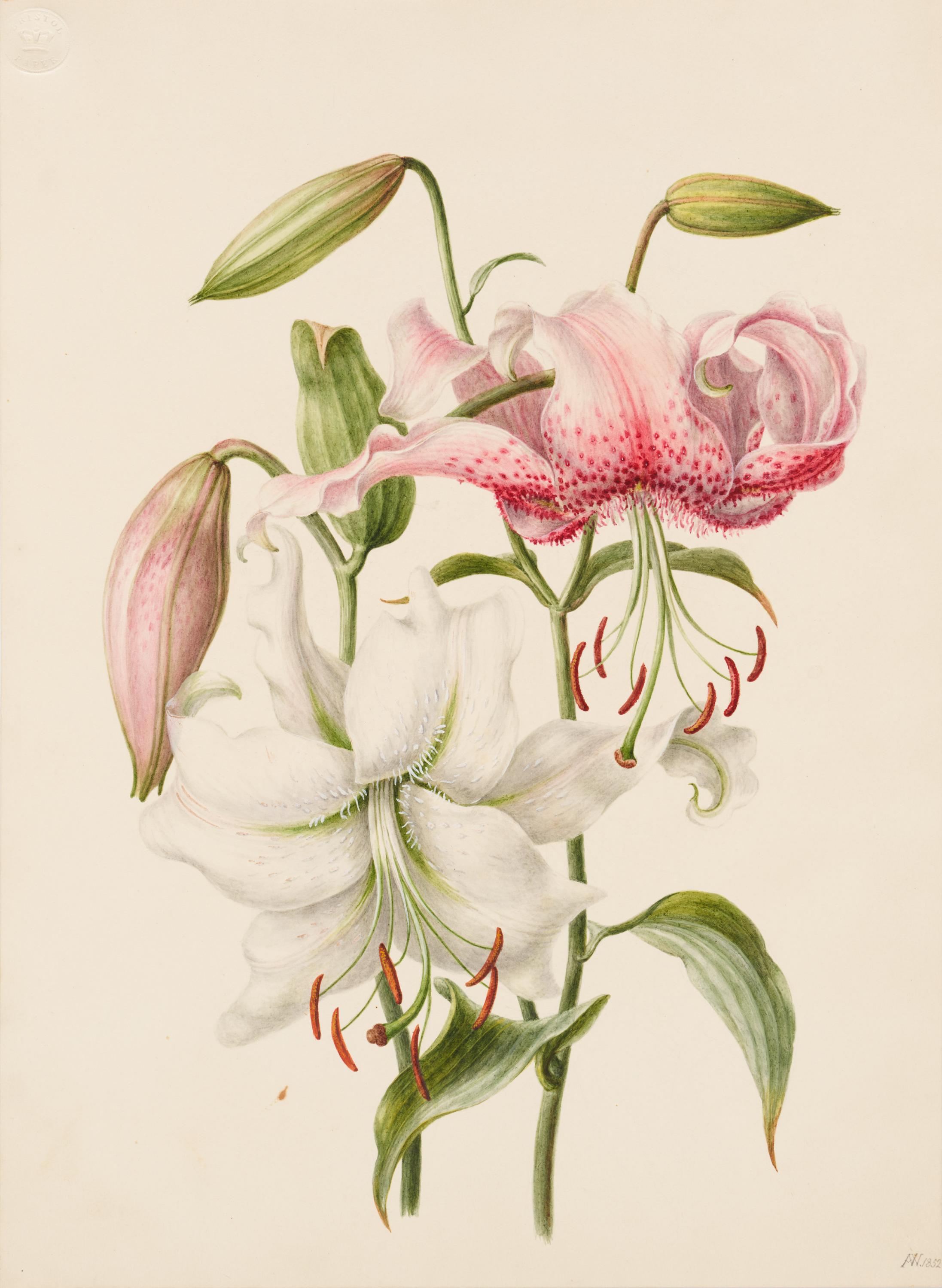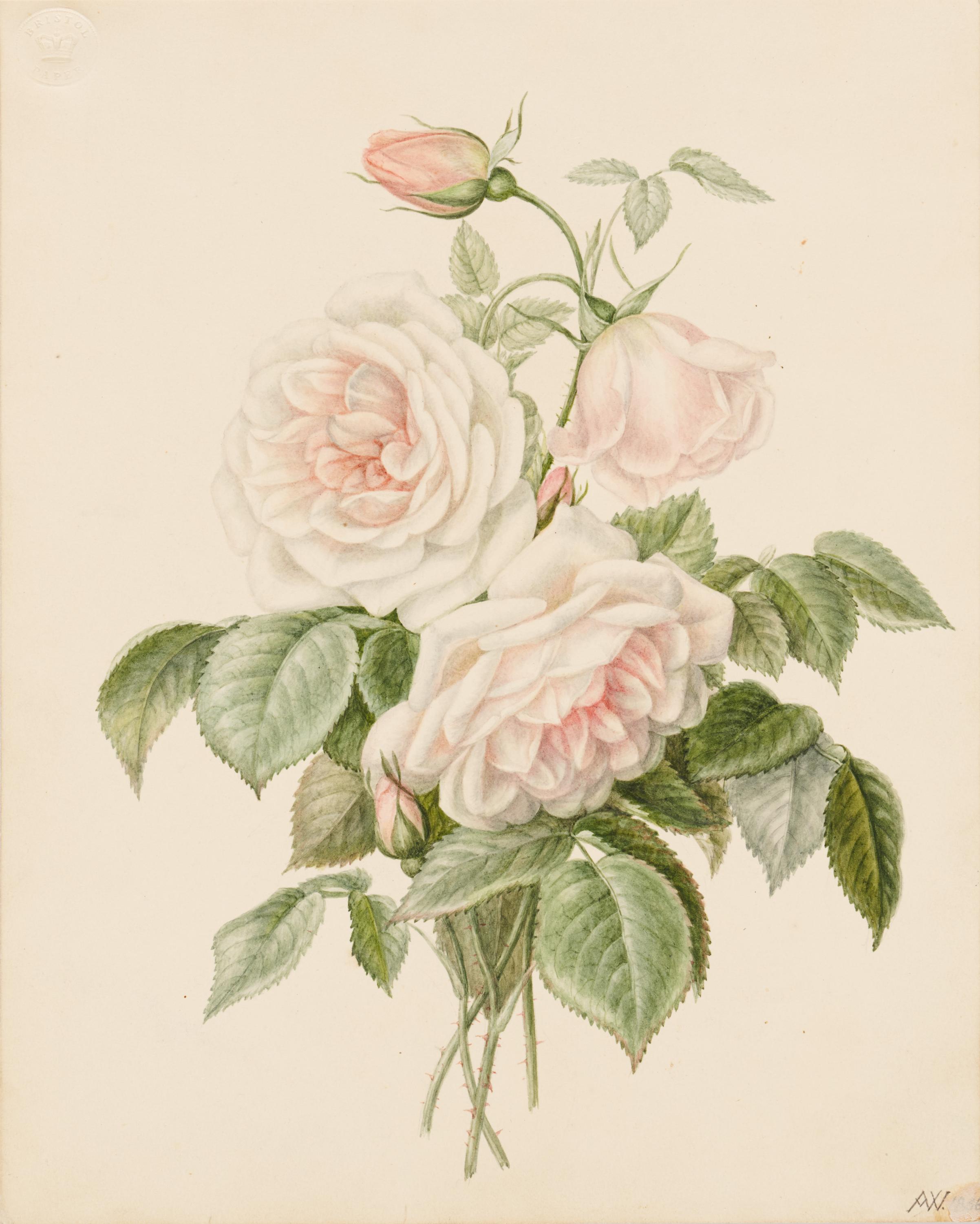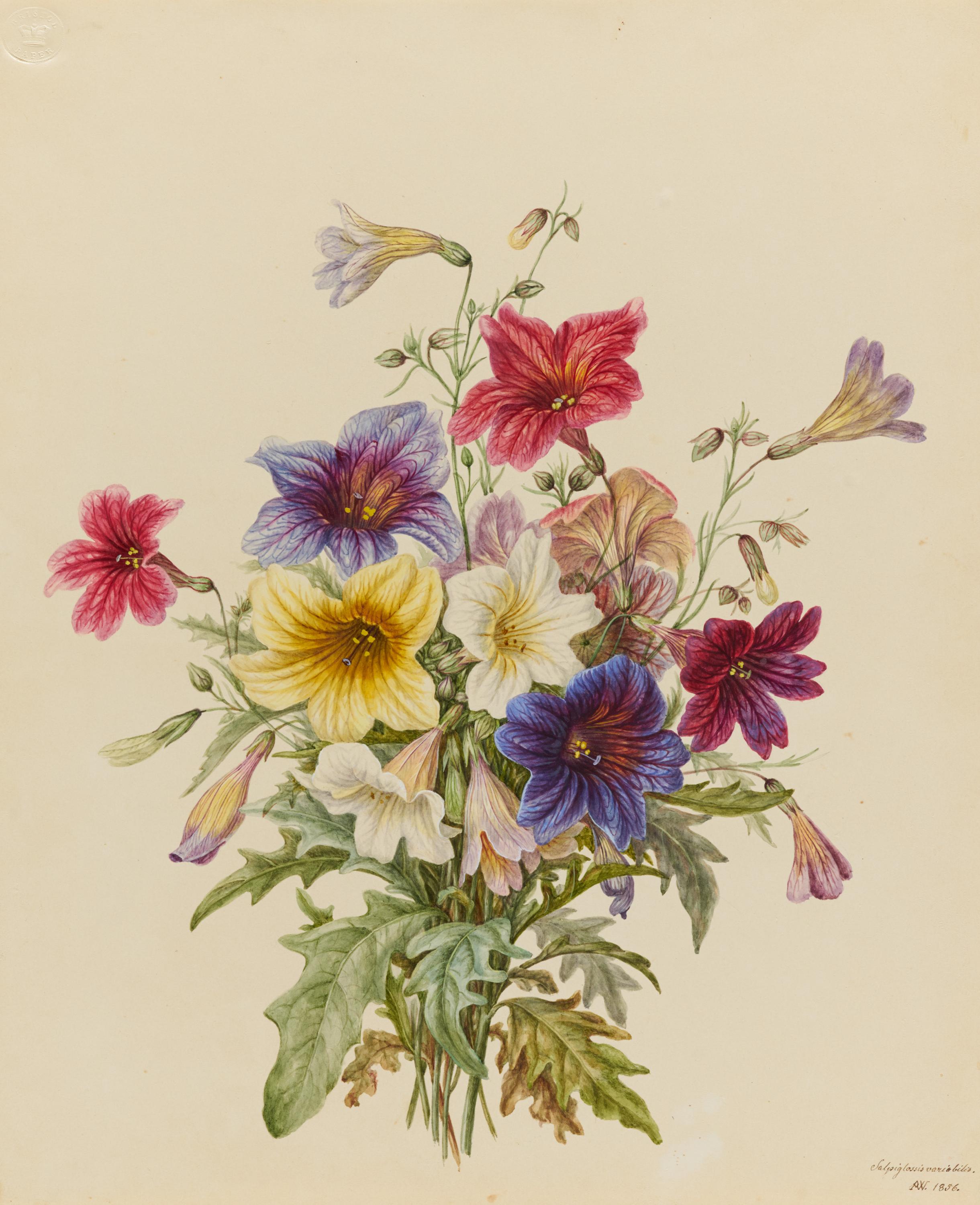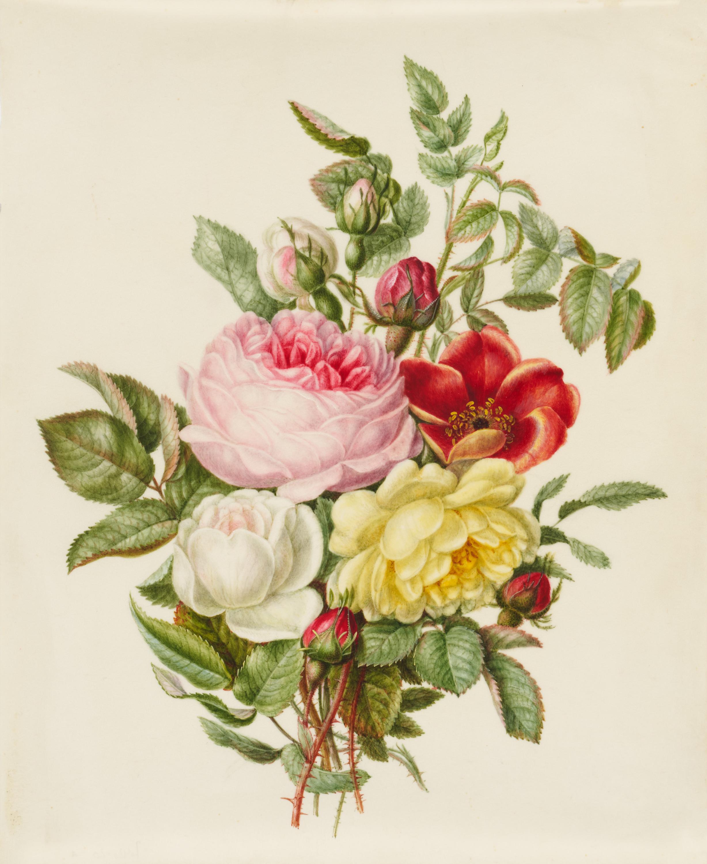 Titel: Fünf Aquarelle: Blumenstudien mit Rosen, Lilien und Trompetenzungen.