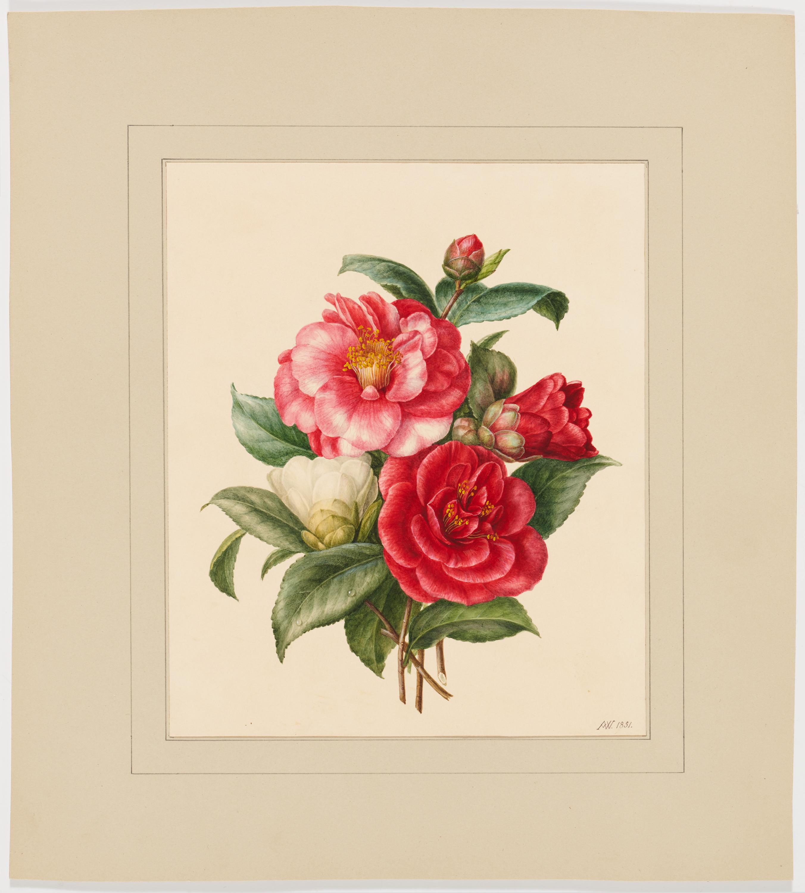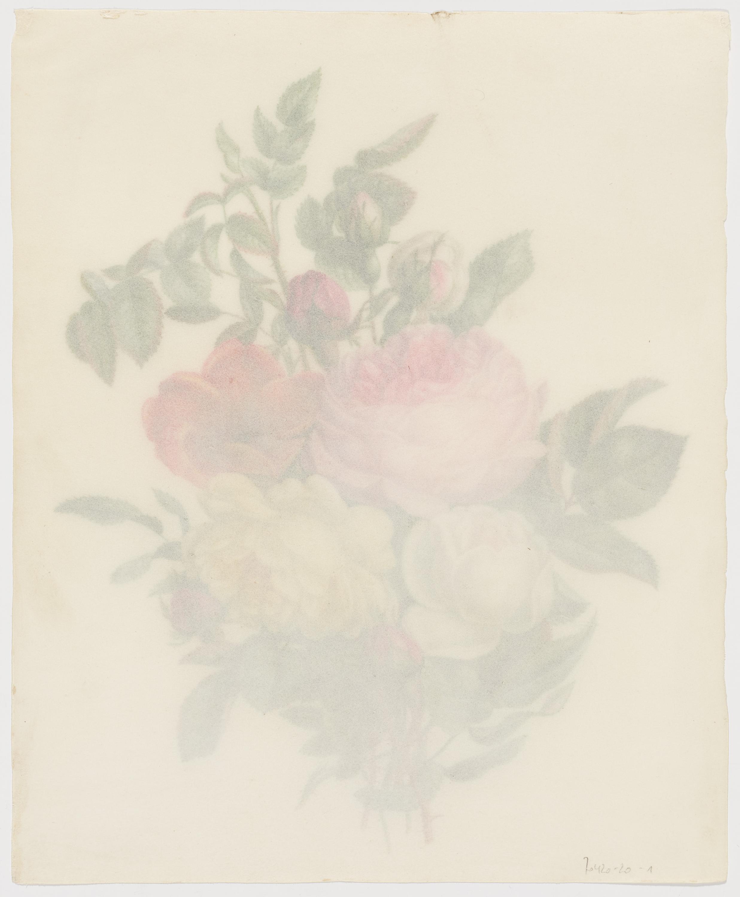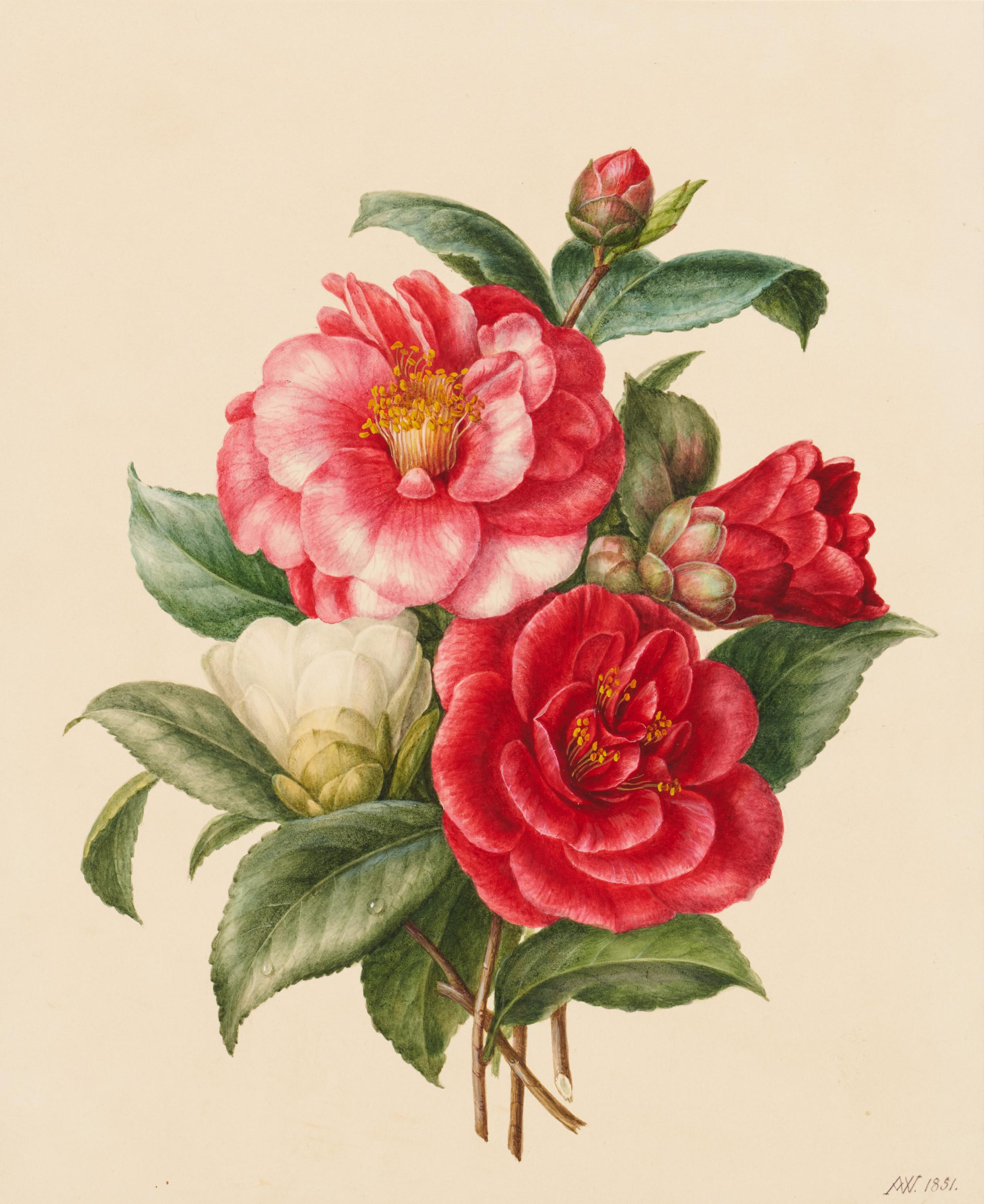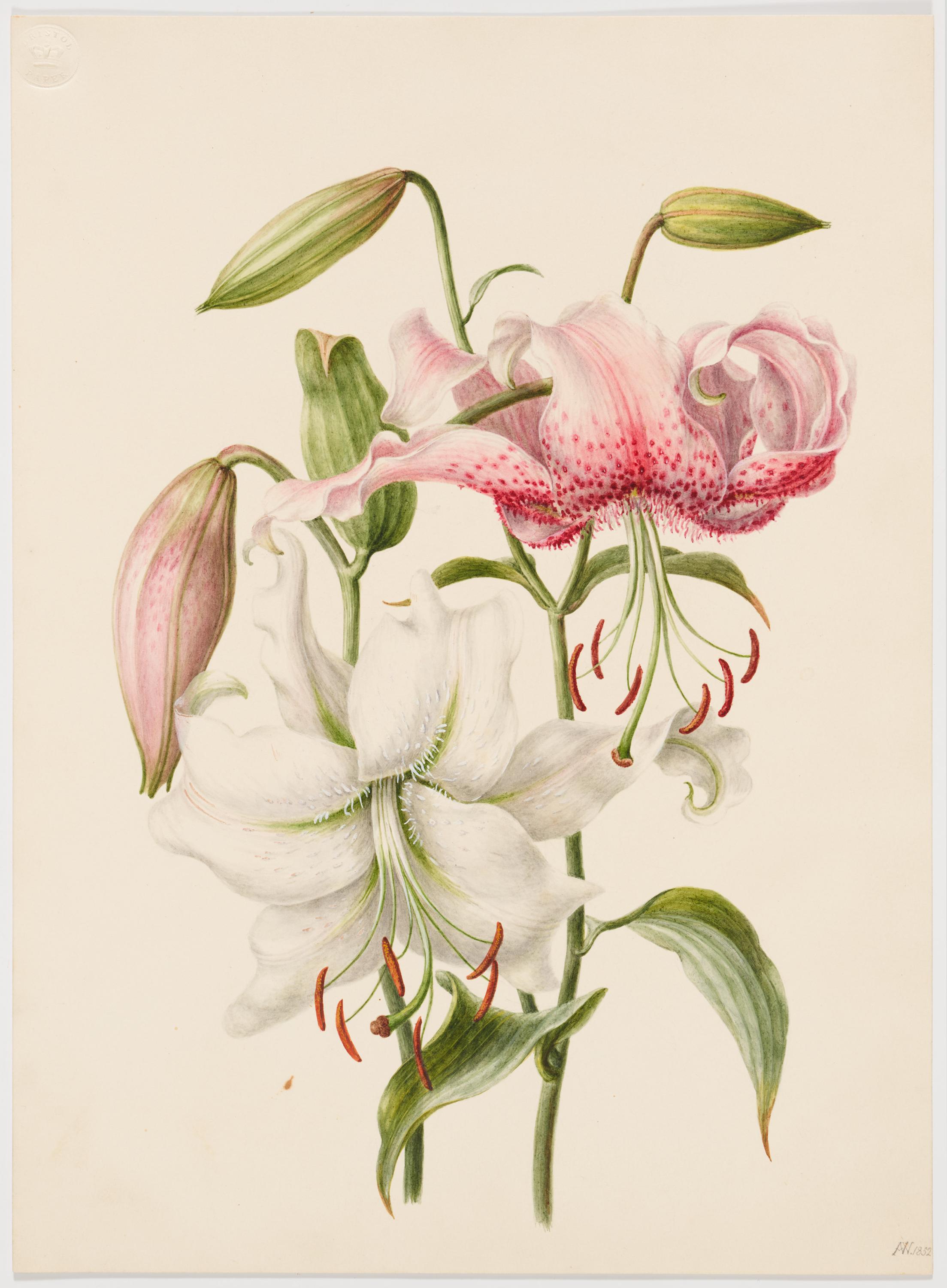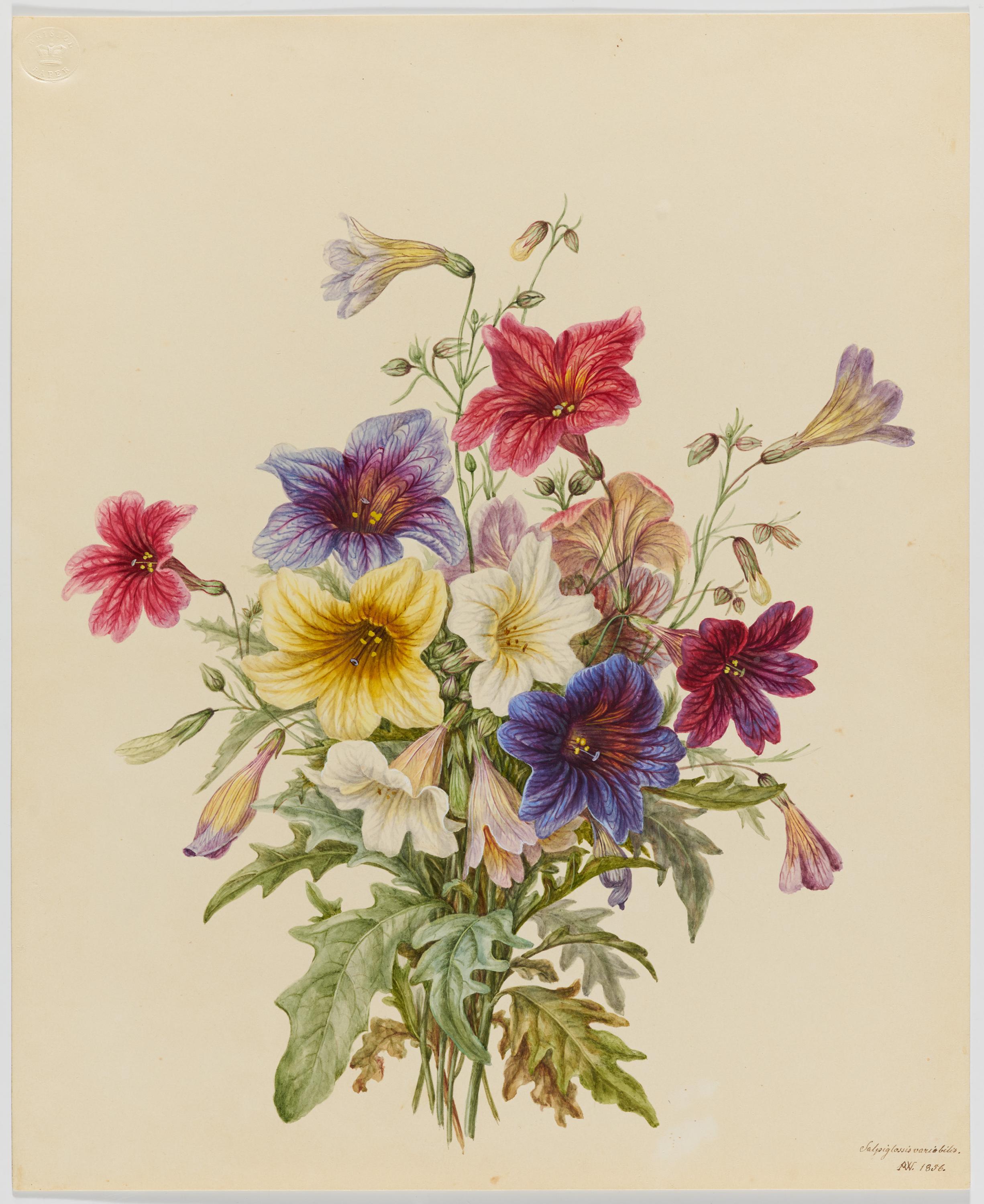 Titel: Fünf Aquarelle: Blumenstudien mit Rosen, Lilien und Trompetenzungen.