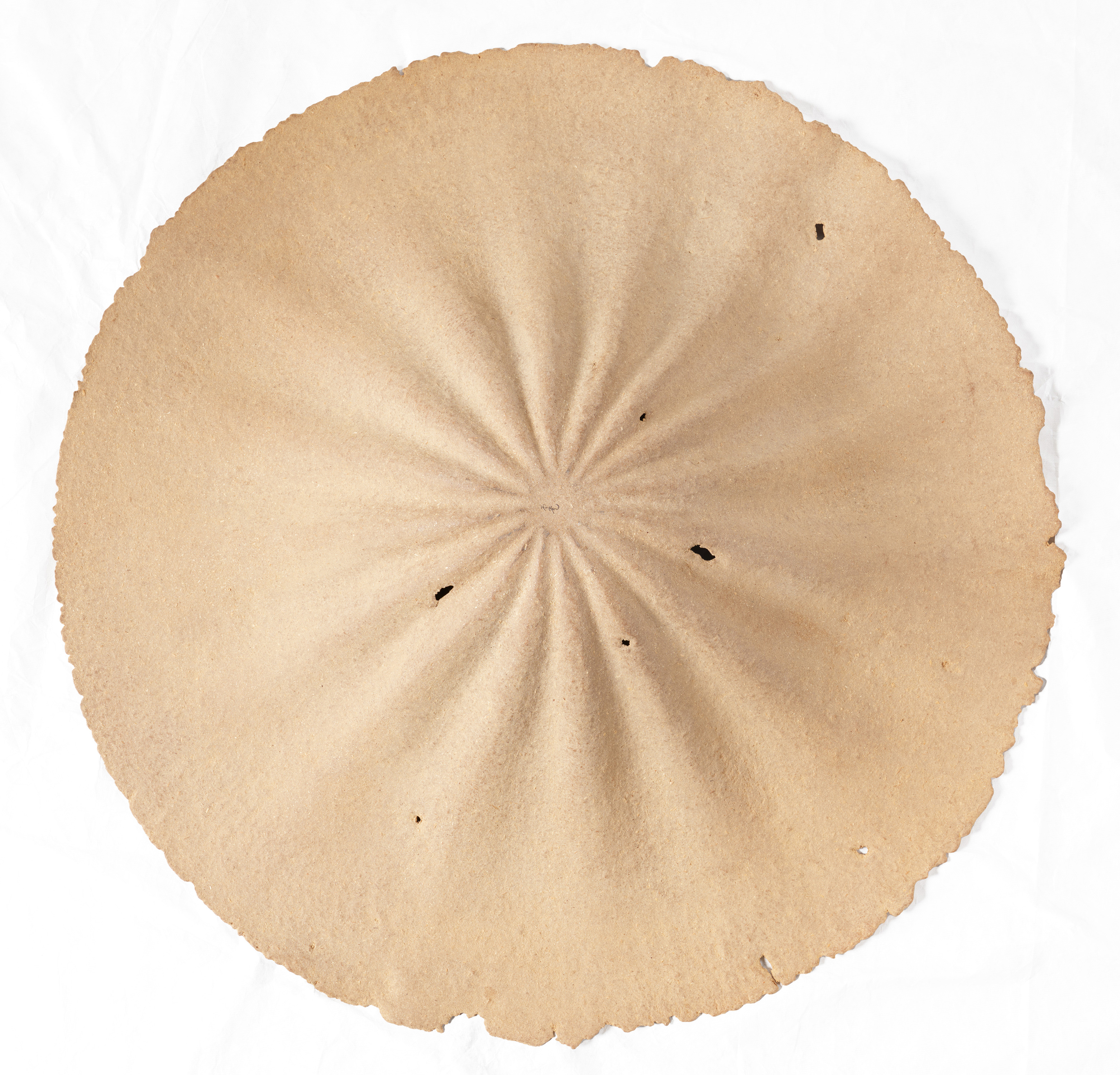 Mehrere herstellungsbedingte Einkerbungen und Löcher (jeweils bis 3cm max.). Standfläche mit schwarzem Aufrieb, Rand mit Griffspuren und Fingerschmutz. Staubablagerungen. Ansonsten guter Zustand.