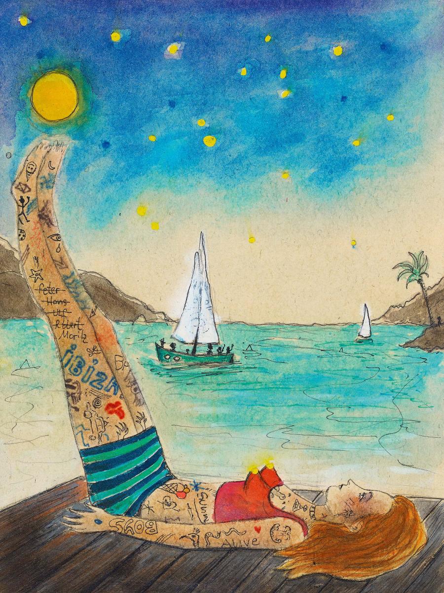 Bezeichnung: Signiert, datiert, betitelt und bezeichnet verso: "Cala LLonga" 2014 IBIZA Corinne von Lebusa Moritz Schleime. Sowie signiert, datiert, betitelt und bezeichnet verso auf einem Stück Klebestreifen auf der Rahmenrückseite.