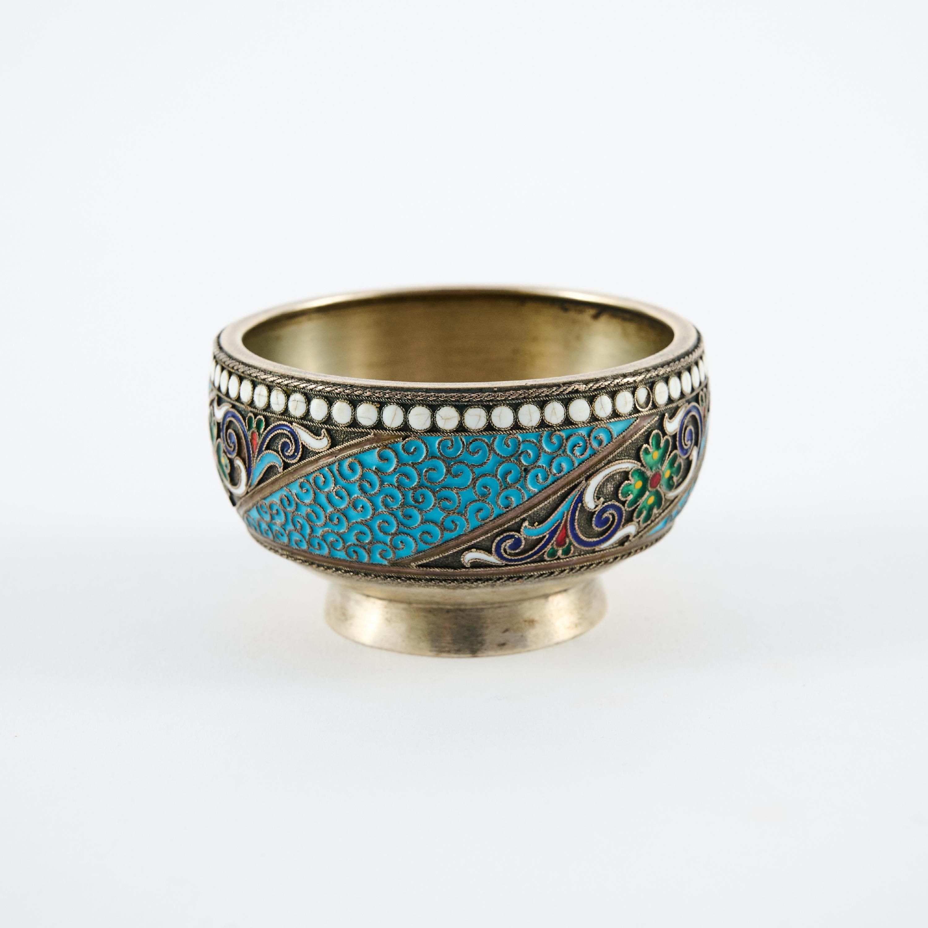 KLEINES SALZGEFÄß MIT FARBIGEM EMAILDEKOR.