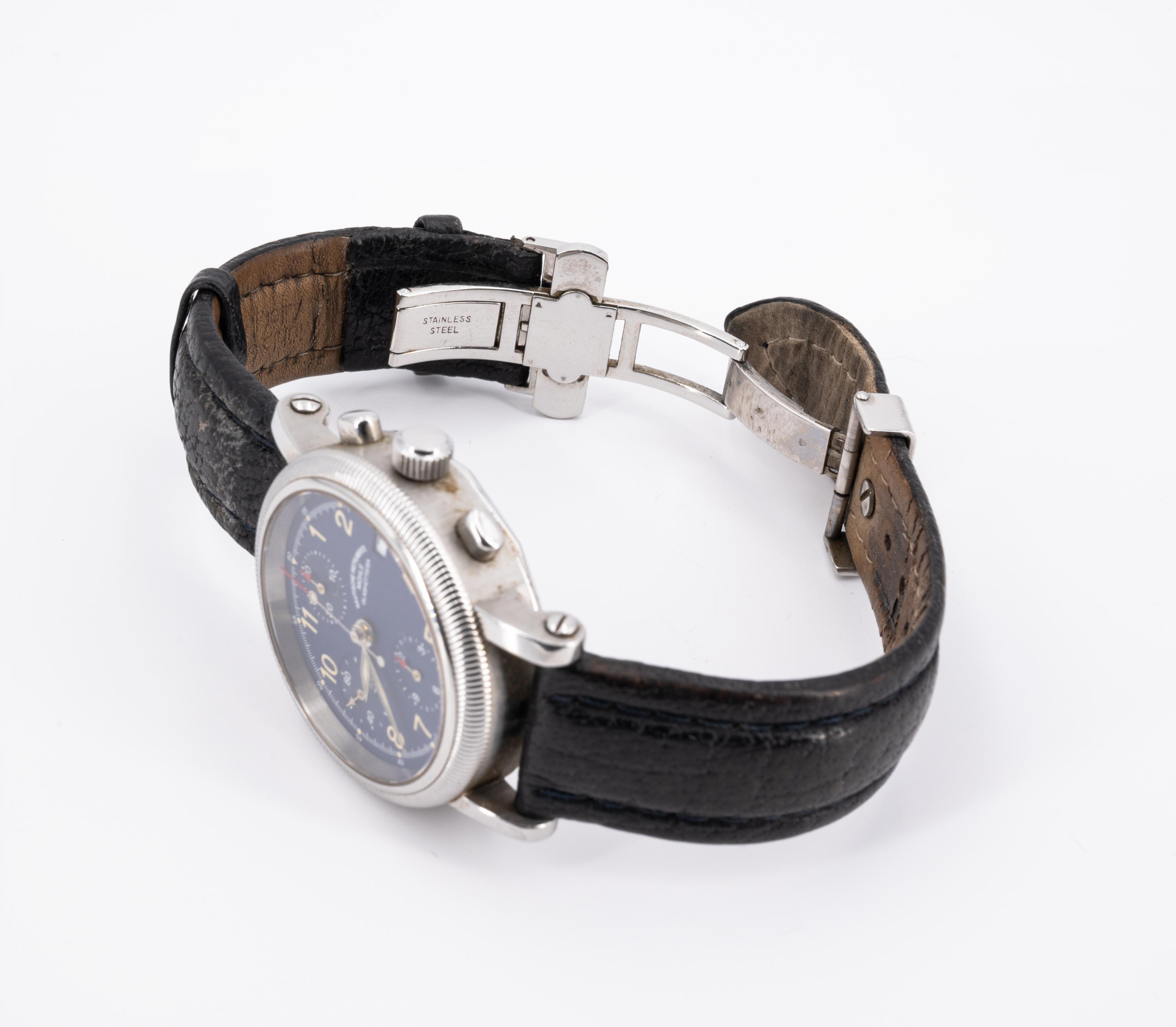 Gehäuse/Armband: Stahl, schwarzes Lederarmband mit Faltschließe, Zffbl. dunkelblau lackiert, Indizes Tritium, Zeiger Tritec.