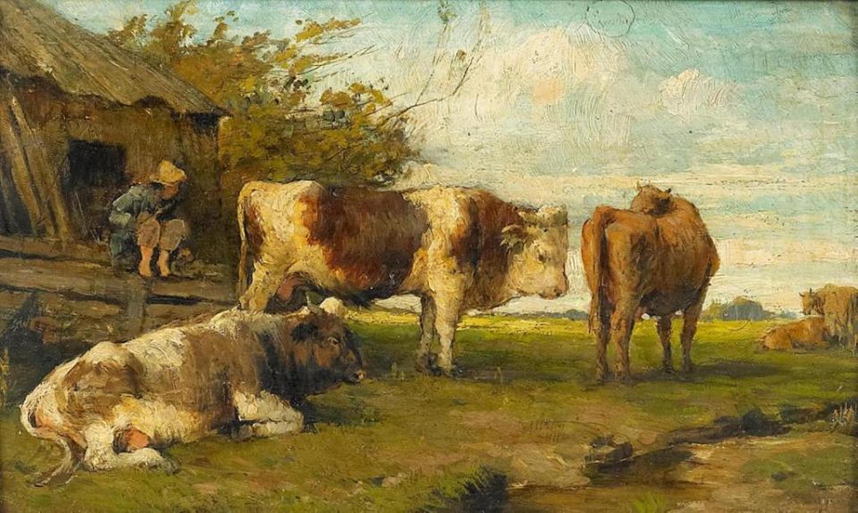 Hütejunge mit Vieh. Öl auf Holz. 15 x 24cm. Rahmen.