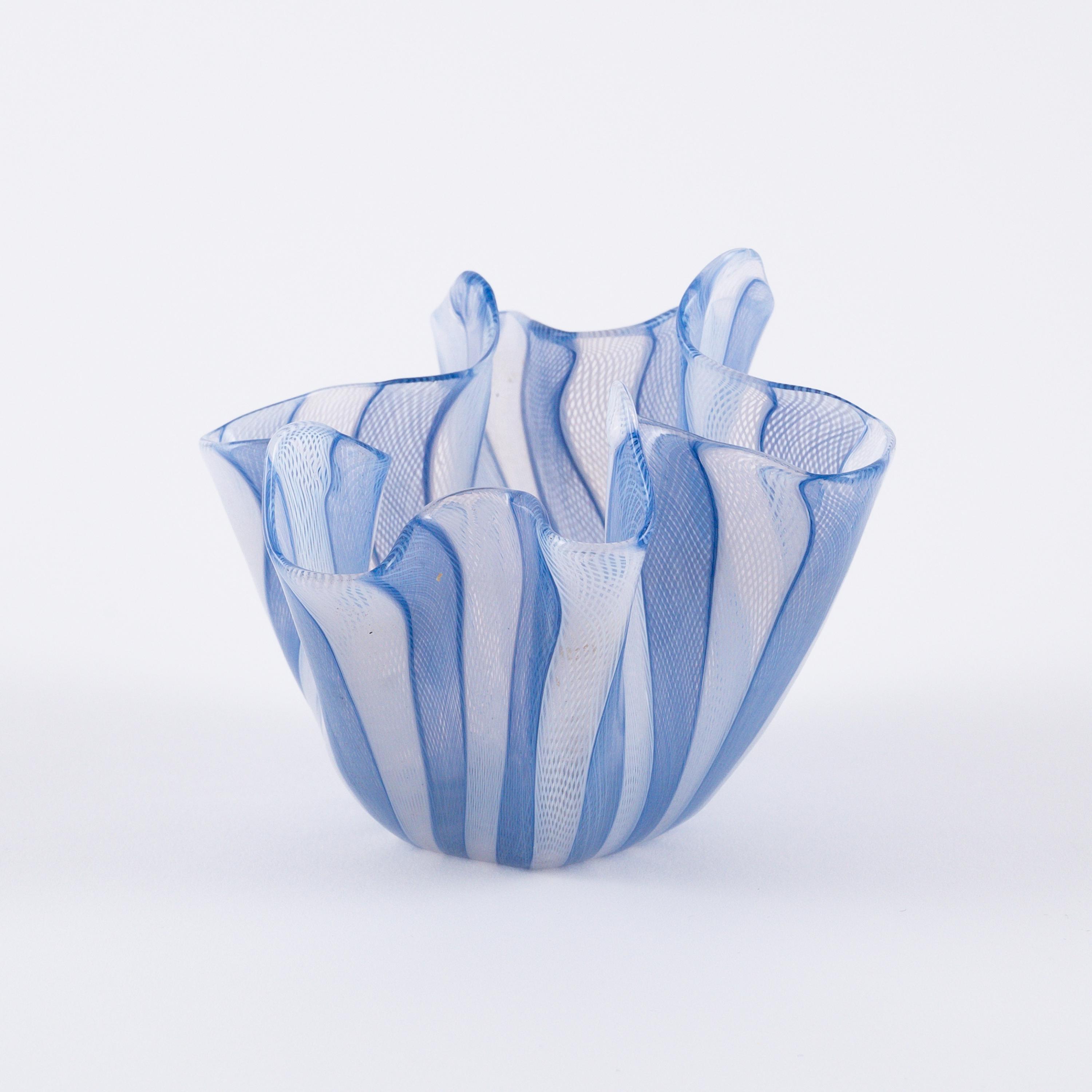 Technik: Farbloses Glas, partiell blaue und weiße Fadeneinschmelzungen.