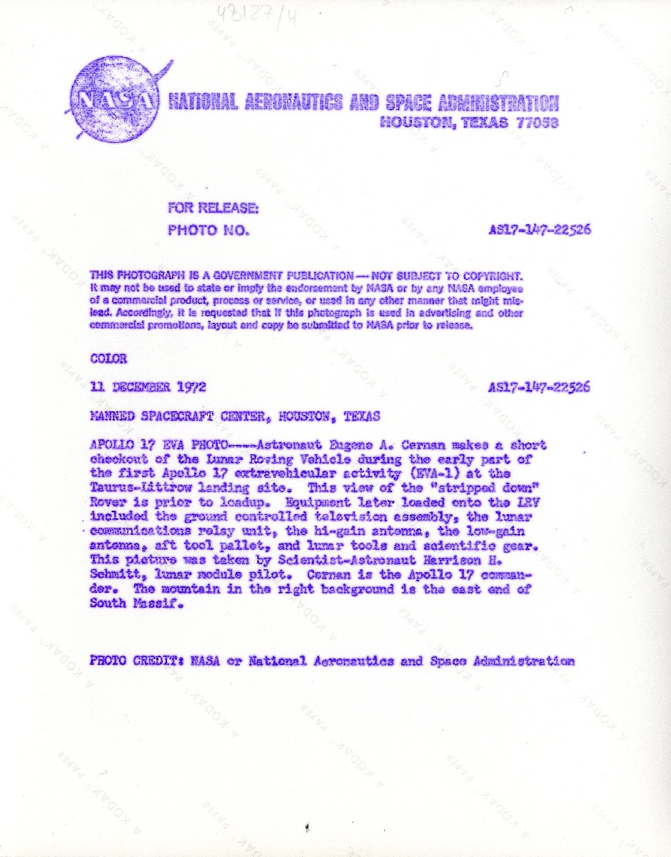 Der Astronaut Eugene A. Cernan im Lunar Roving Vehicle (Apollo 17). 11. Dezember 1972. C-Print. Aufdruck der NASA am oberen Blattrand. Rückseitig Aufdruck der NASA mit Angaben zum Bild. Kodak-Papier auf Passepartout. 18.