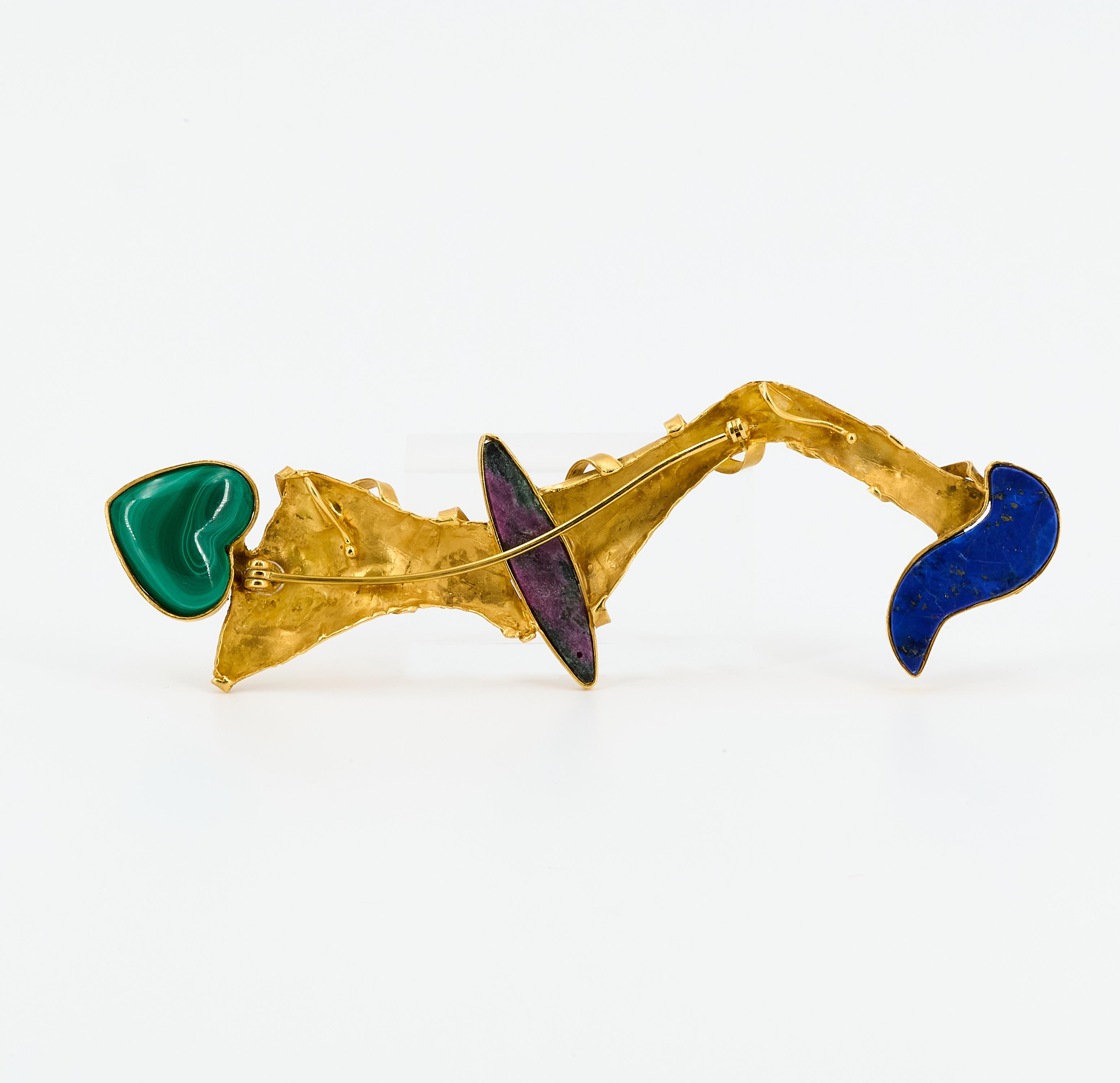 Edelsteine: 1 geschnitzer Lapislazuli, organisch geformt ca. 3,2 x 1,0 cm, 1 navetteförmiger Stein im Sugarloaf-Schliff, wohl Rubin ca. 3,8 x 0,7 cm, 1 Malachit im herzförmigen Cabochon-Schliff ca. 2,2 x 1,7 cm.