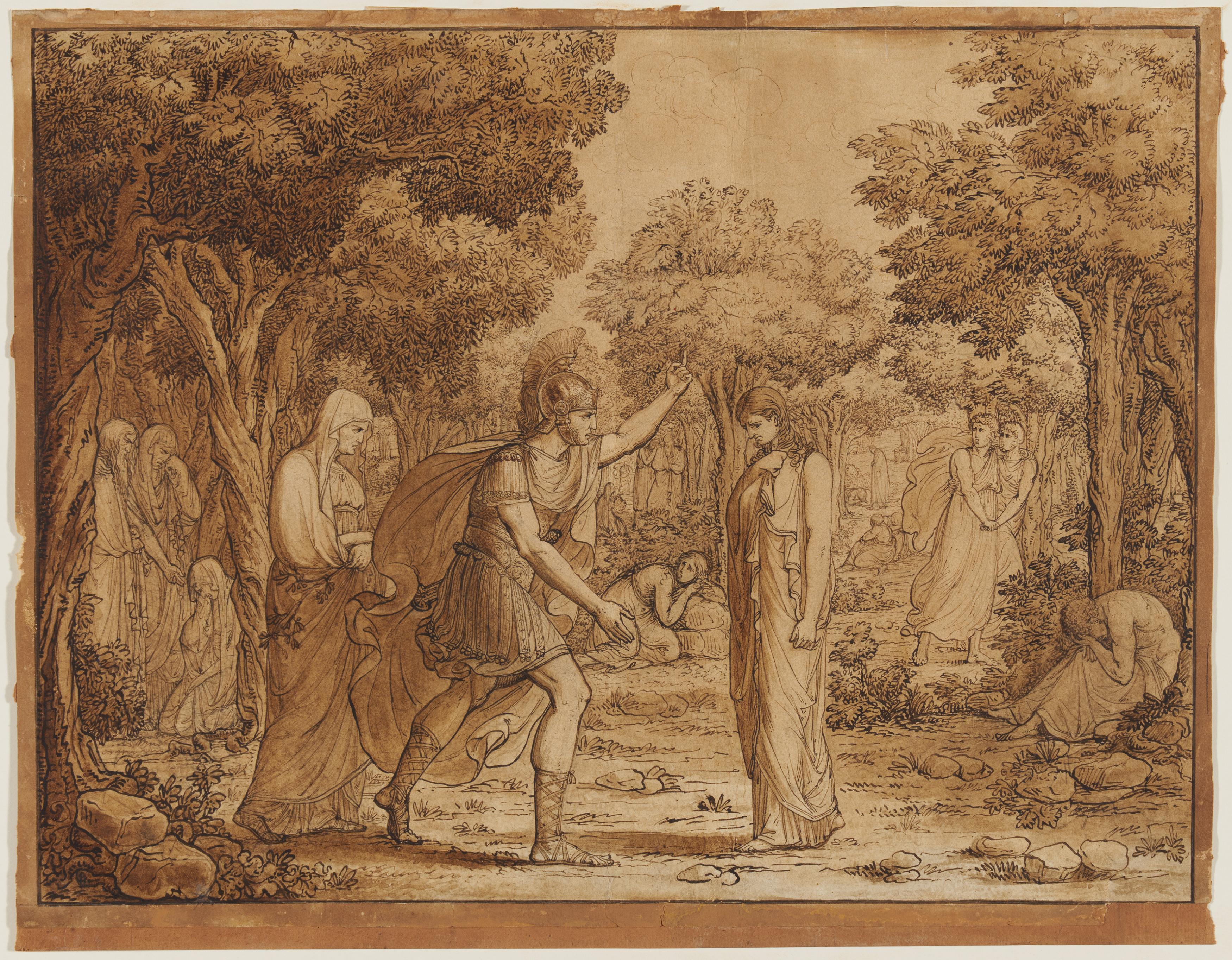 Technik: Feder und braune Tinte, Aquarell, Bleistift (?) auf Papier.