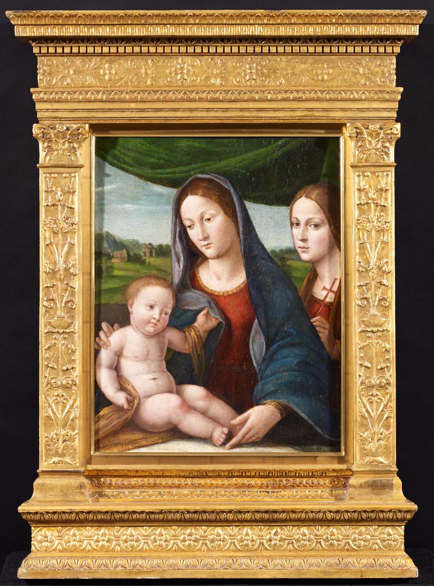 Titel: Madonna mit Kind und einer Heiligen (Brigida?) vor Landschaftshintergrund.