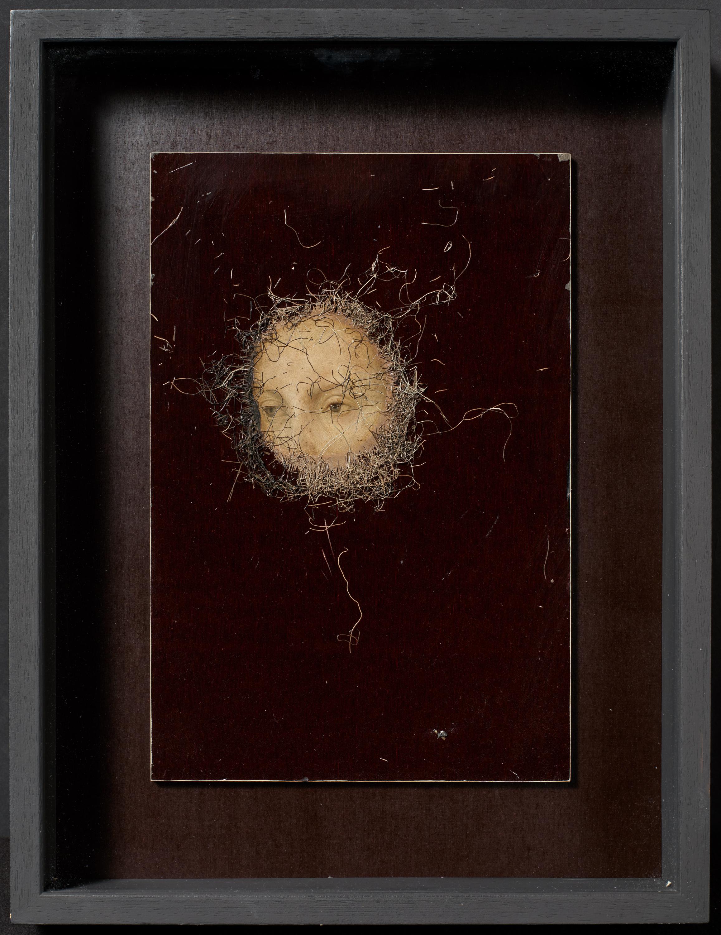 Technik: Mischtechnik (Öl auf Papier, Metallspäne) auf Holz.