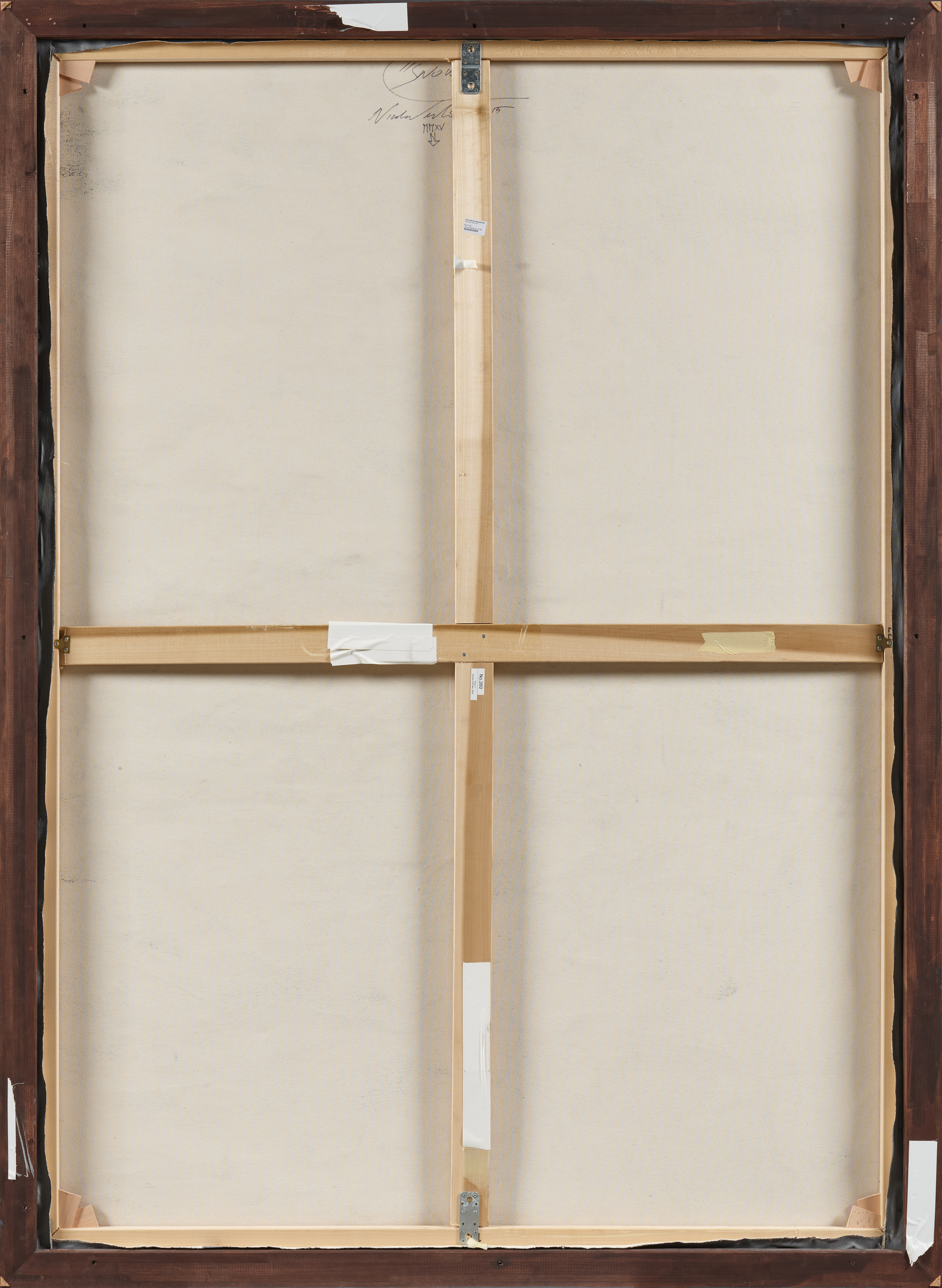 Geringe Leinwandspannung, daher partiell leicht durchdrückender Keilrahmen. Ansonsten sehr guter Zustand. Im Rahmen beschrieben.