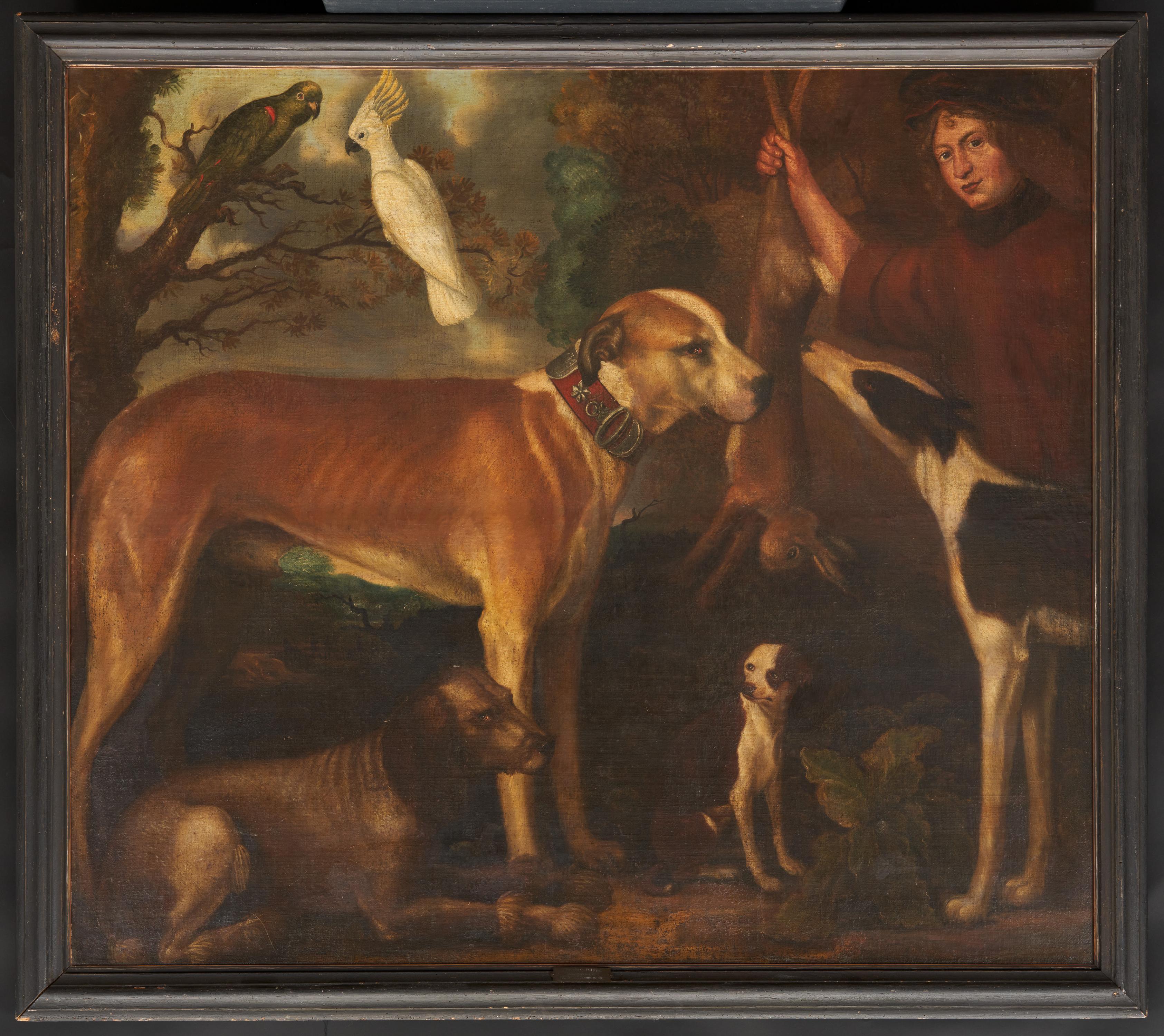 Titel: Jagdhund mit Beute und exotischen Vögeln.