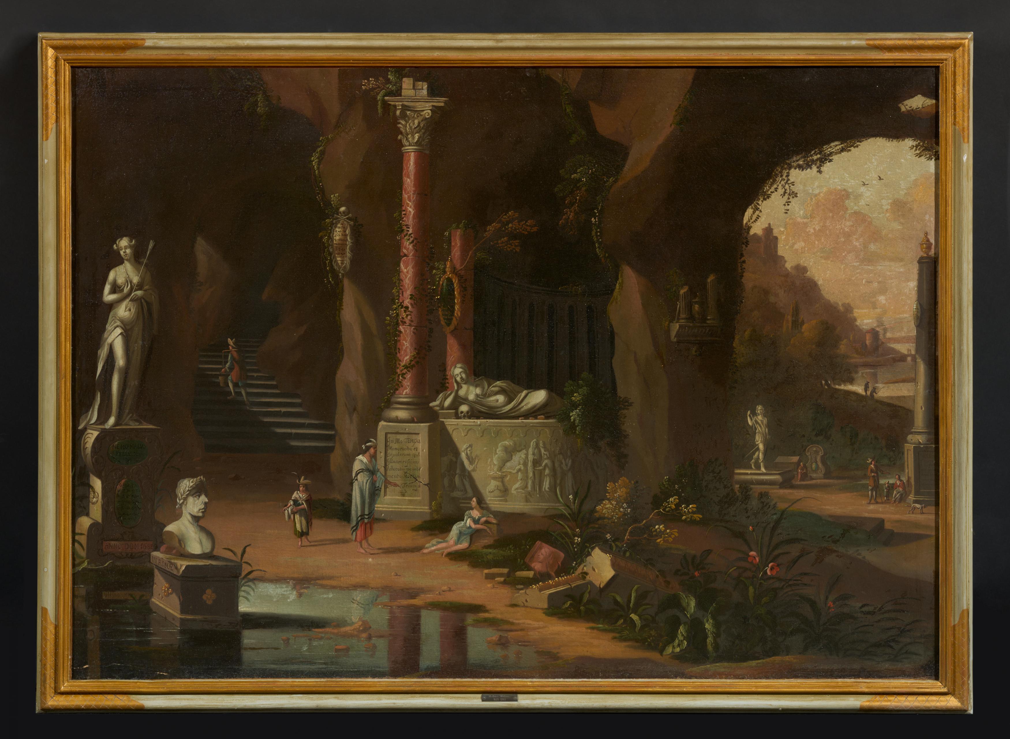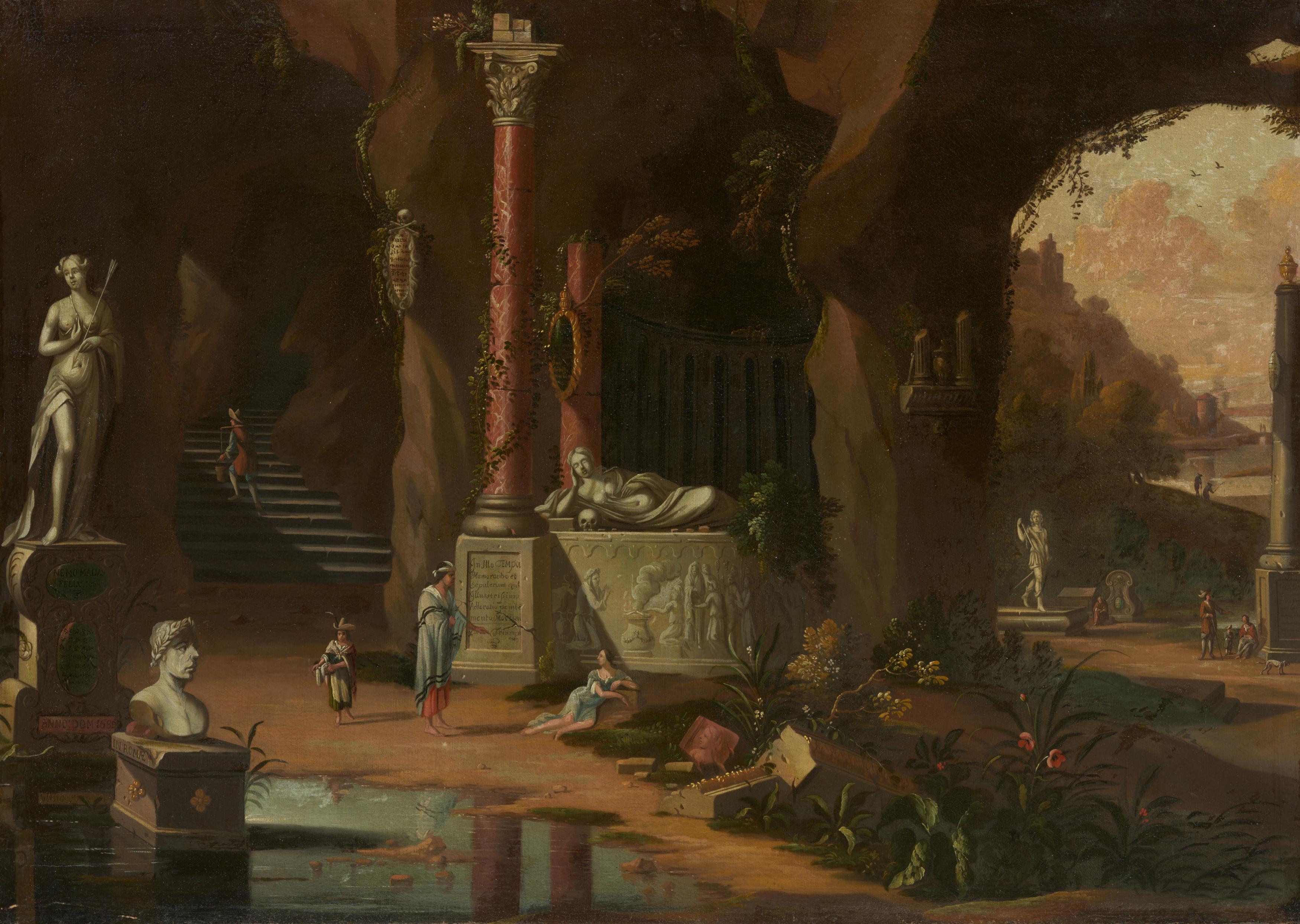 Titel: Grottenlandschaft mit antiken Monumenten.