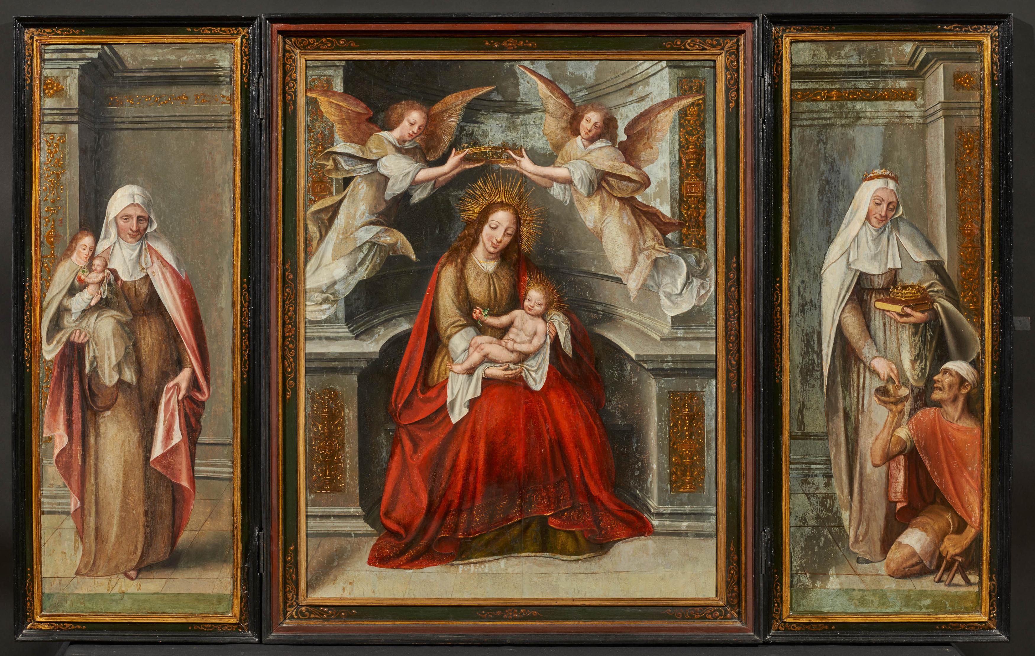 Triptychon: zentral Maria mit dem Christuskind, von Engeln gekrönt..