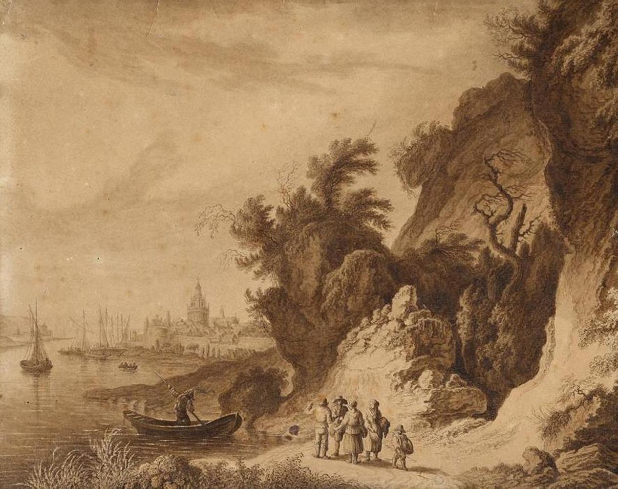Flußlandschaft mit Seglern und Figurenstaffage. Tusche, braun laviert auf Papier. 28,7 x 36,4cm.