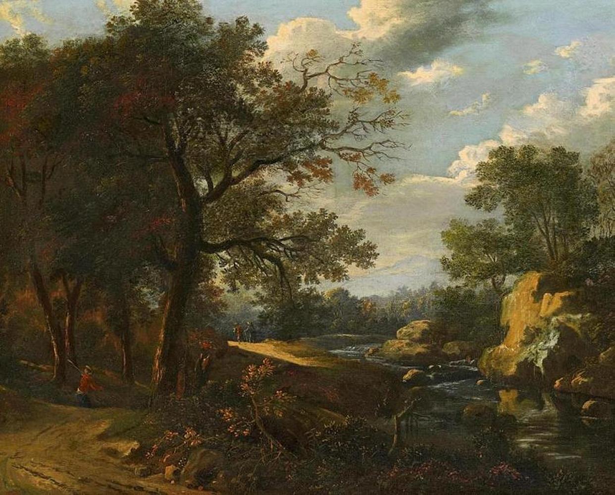 Italienische Landschaft mit Reisenden am Fluss. Öl auf Leinwand. Doubliert. 59 x 75cm. Rahmen.