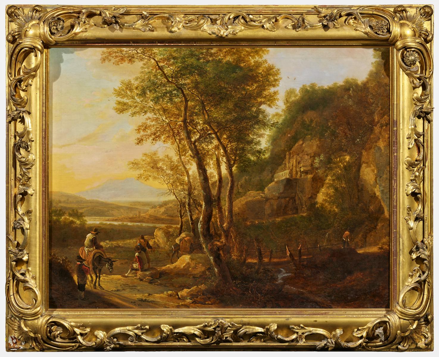 Titel: Italienische Flusslandschaft mit Eselreitern an einem Bachlauf.