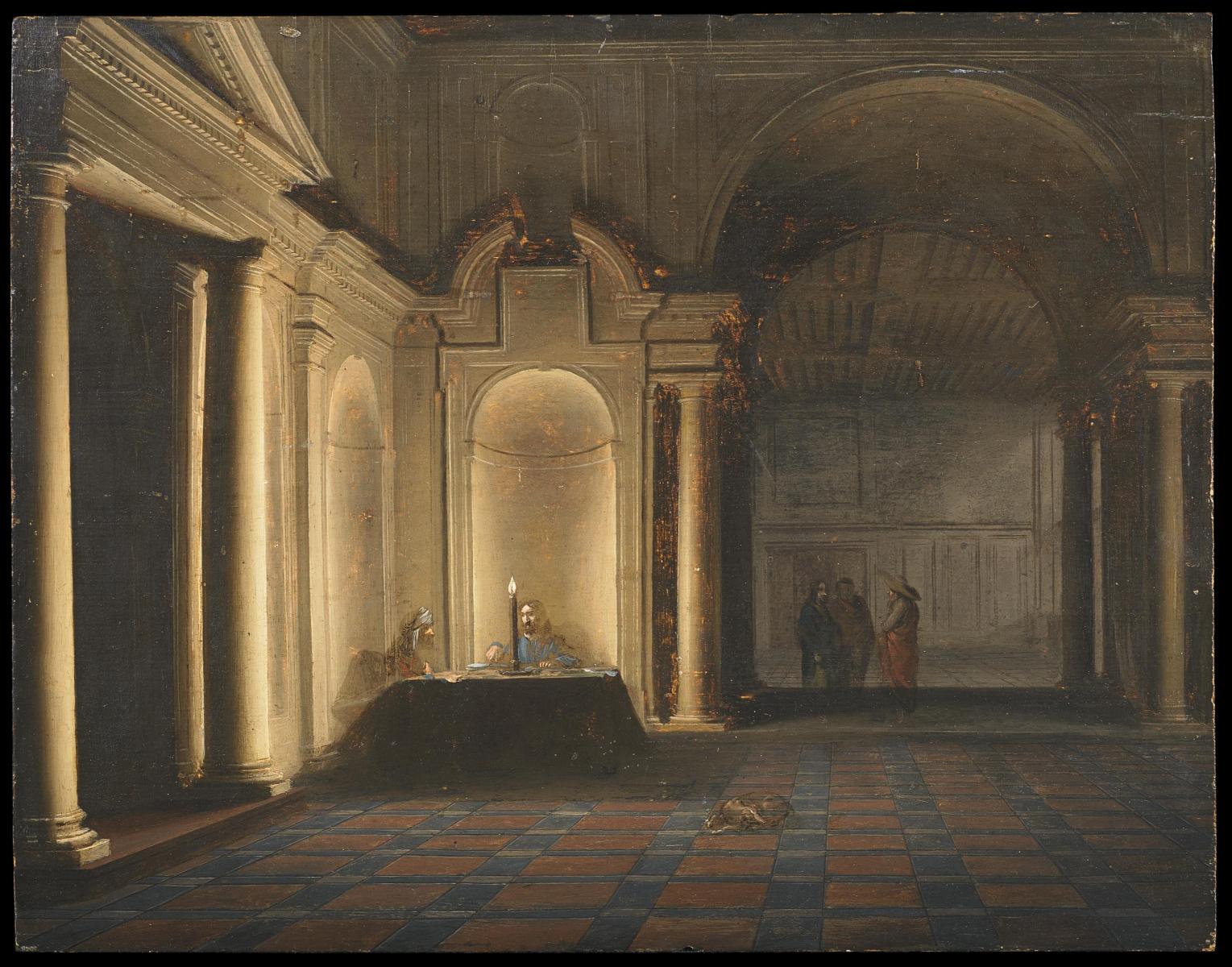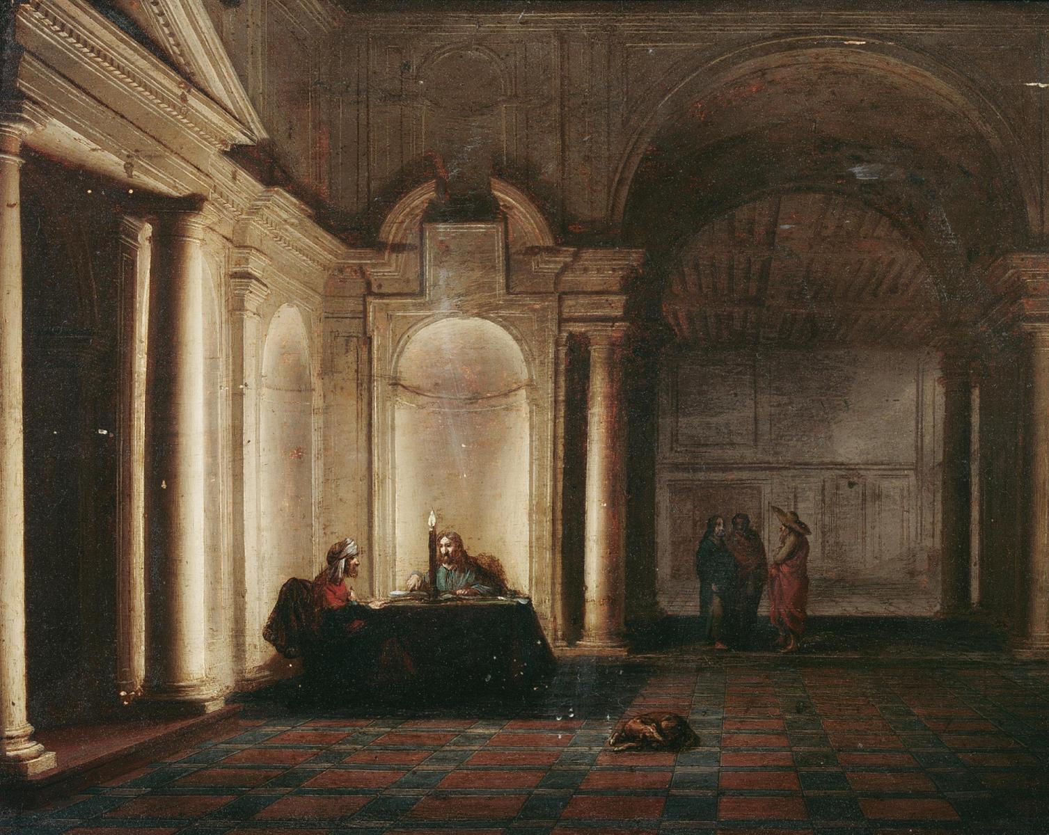 Titel: Kircheninterieur mit diskutierenden Schriftgelehrten bei Kerzenschein.