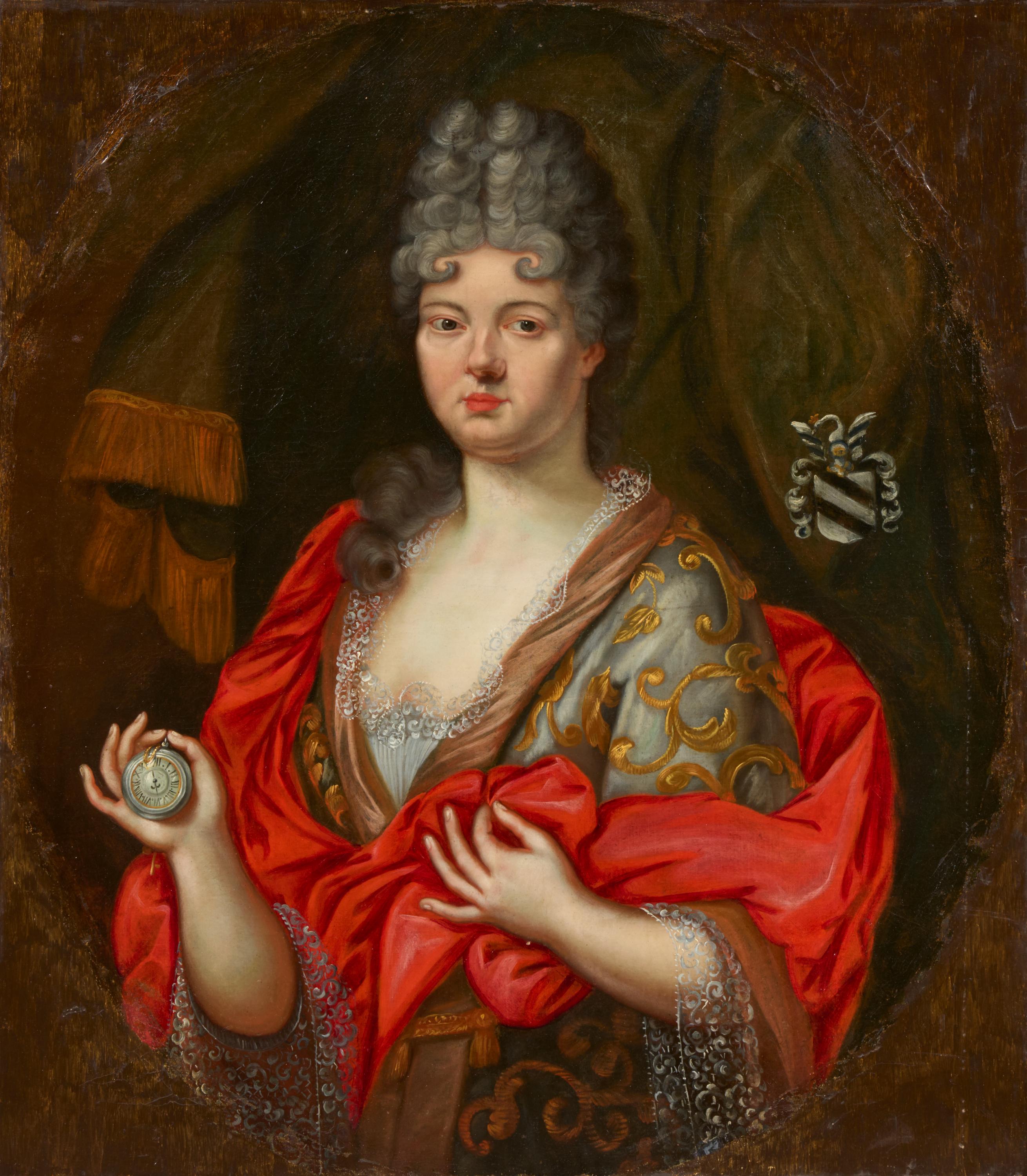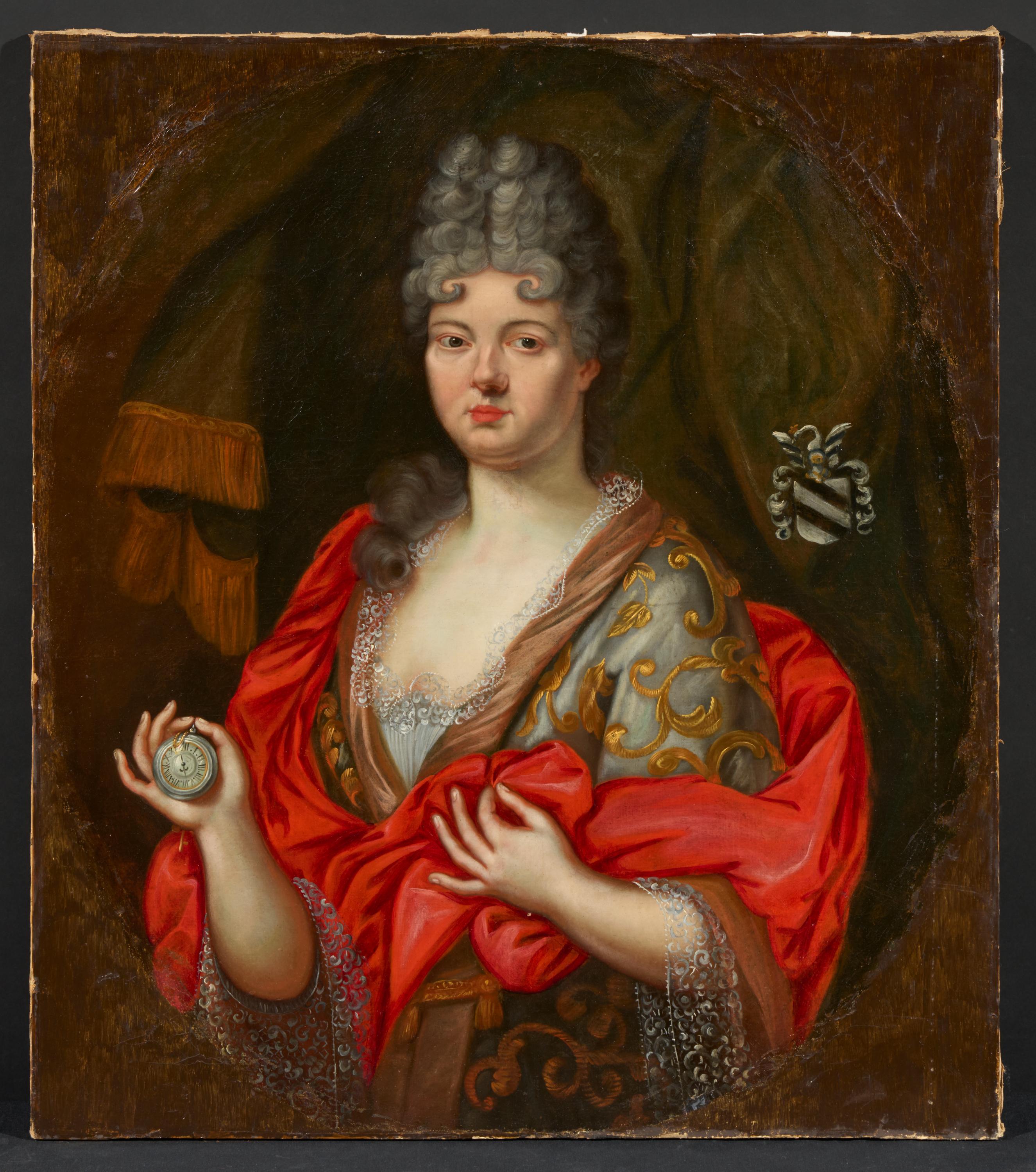 Titel: Porträt von Agnes von Weers mit einer Taschenuhr in der rechten Hand.