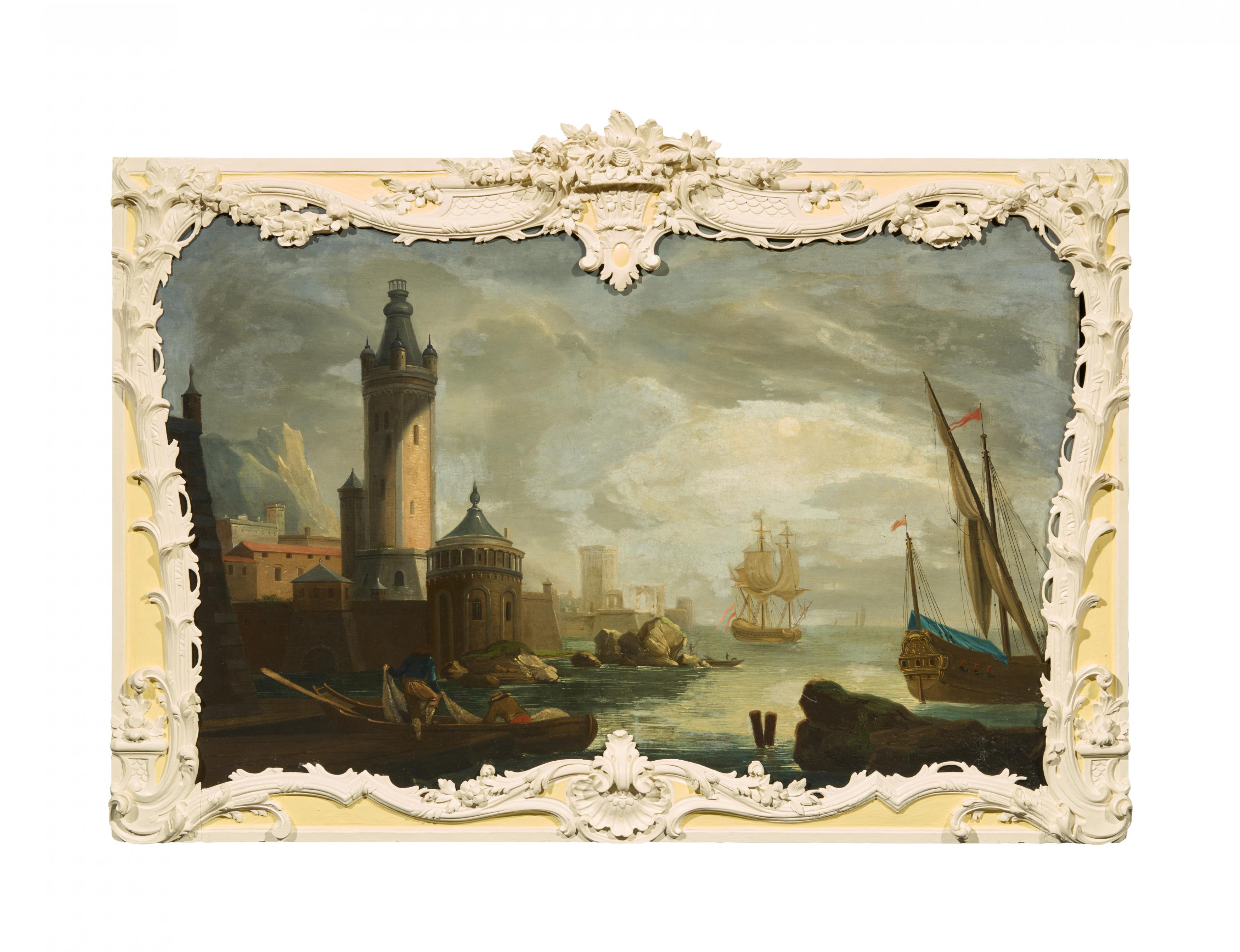 Titel: Segelschiffe und Fischer vorm Hafen.