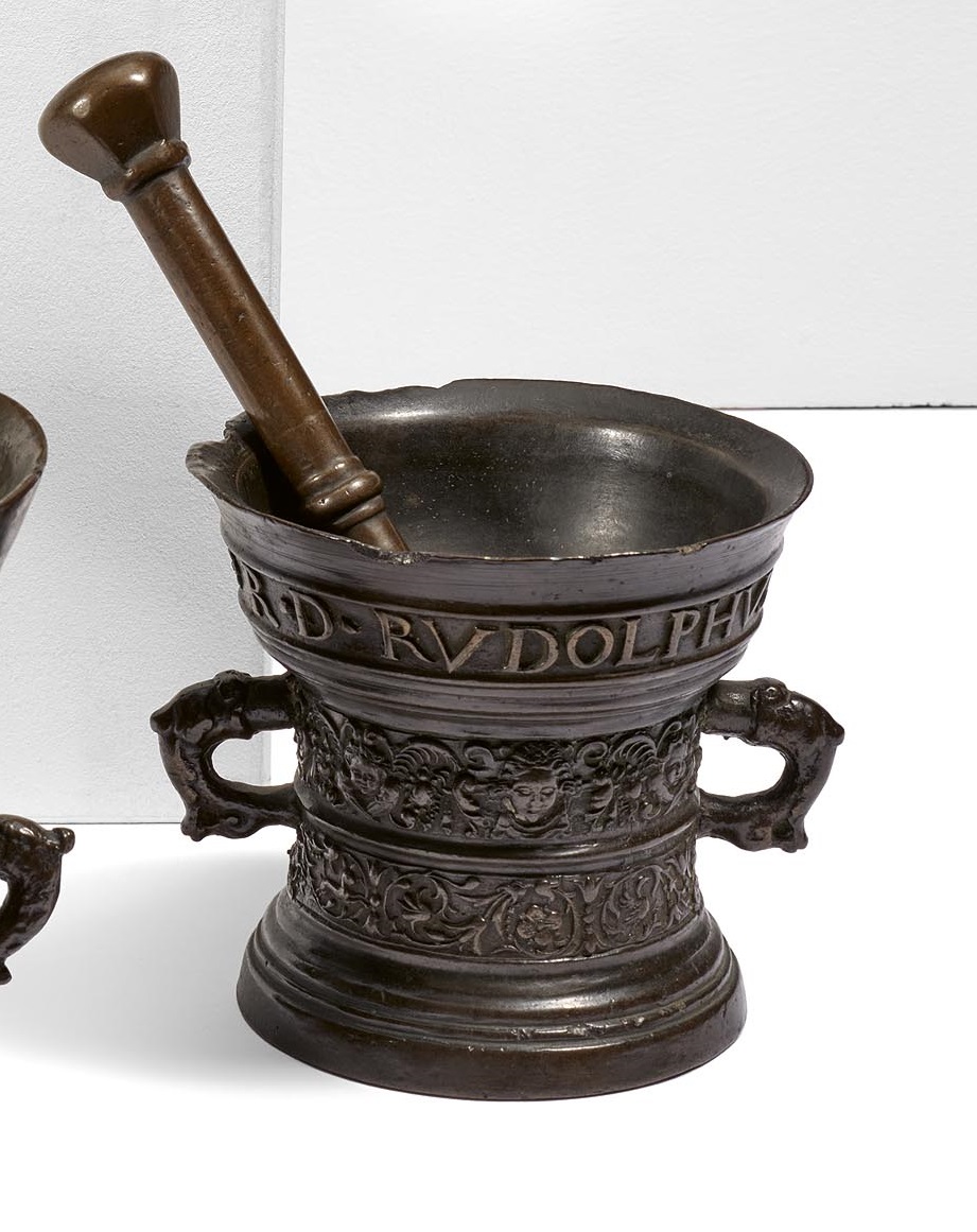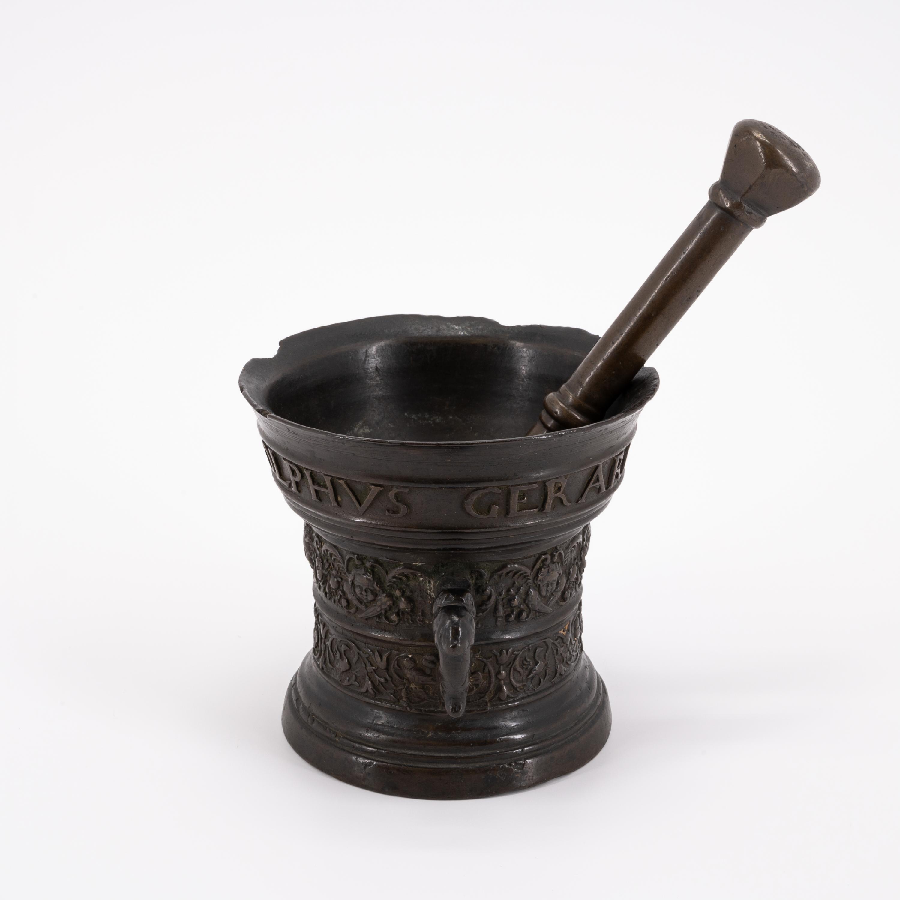 EIN KLEINER MÖRSER MIT ORNAMENTBÄNDERN.