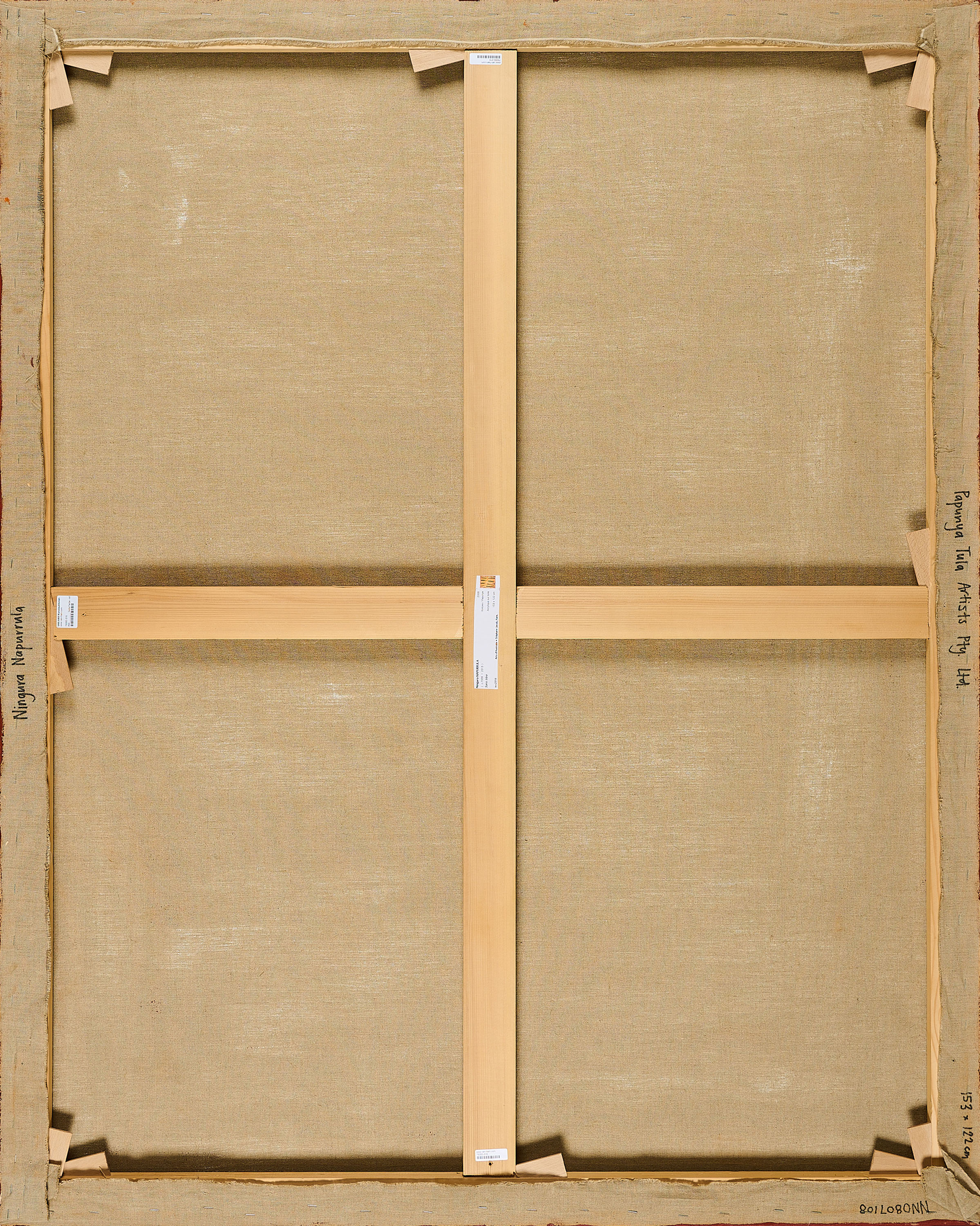 Bezeichnung: Signiert auf der umgeschlagenen Leinwand: Ningura Napurrula. Hier zudem mit Werkangaben versehen.