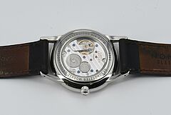 Gehäuse/Armband: Stahl, schwarzes Lederarmband mit Dornschließe, Zffbl. weiß/beige lackiert, Zeiger/Indizes silbern.