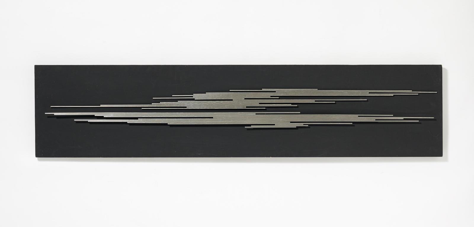 . Technik: Parallel verlaufende miteinander verbundene Metallstäbe, auf schwarzer Spanholzplatte montiert..