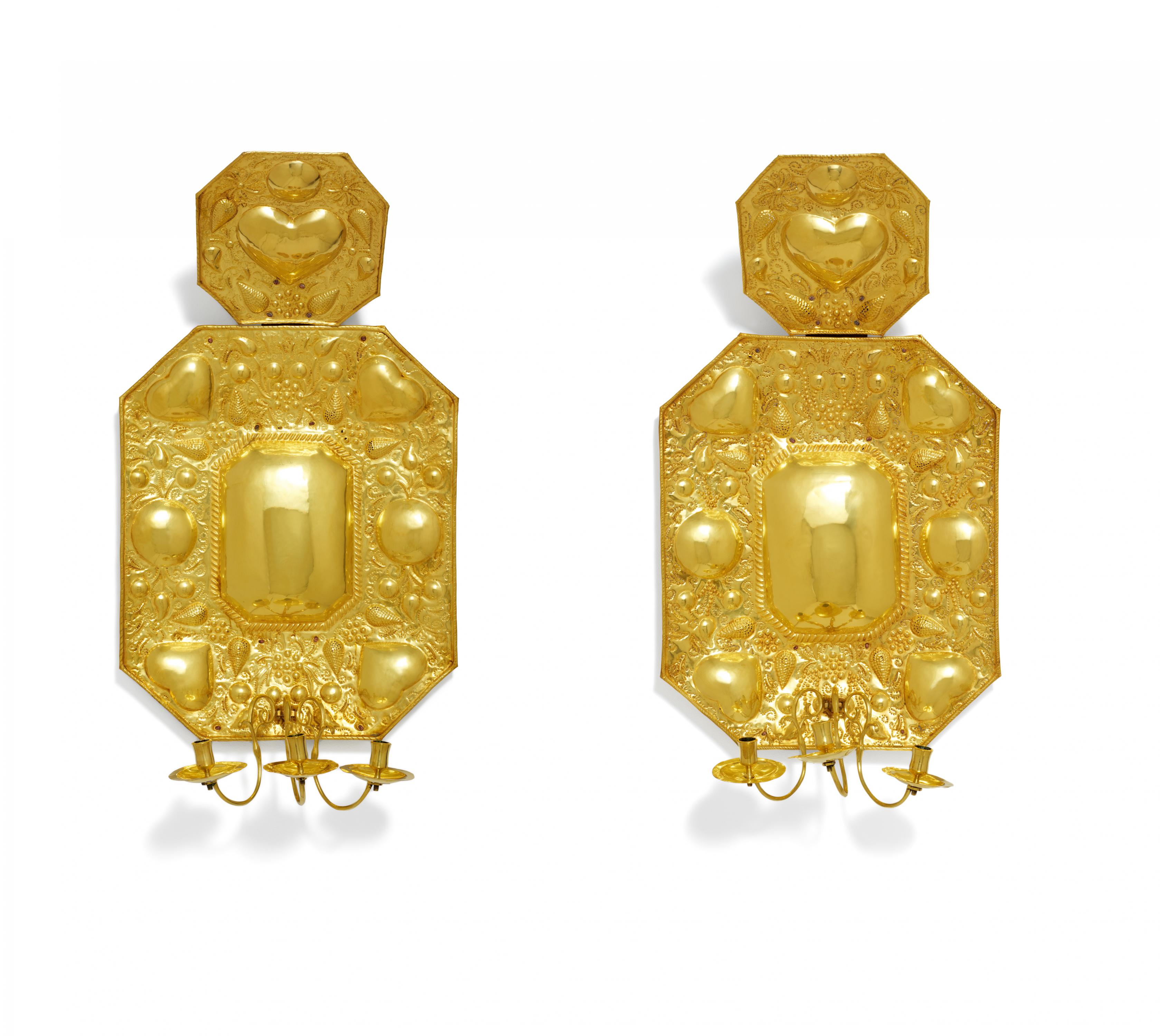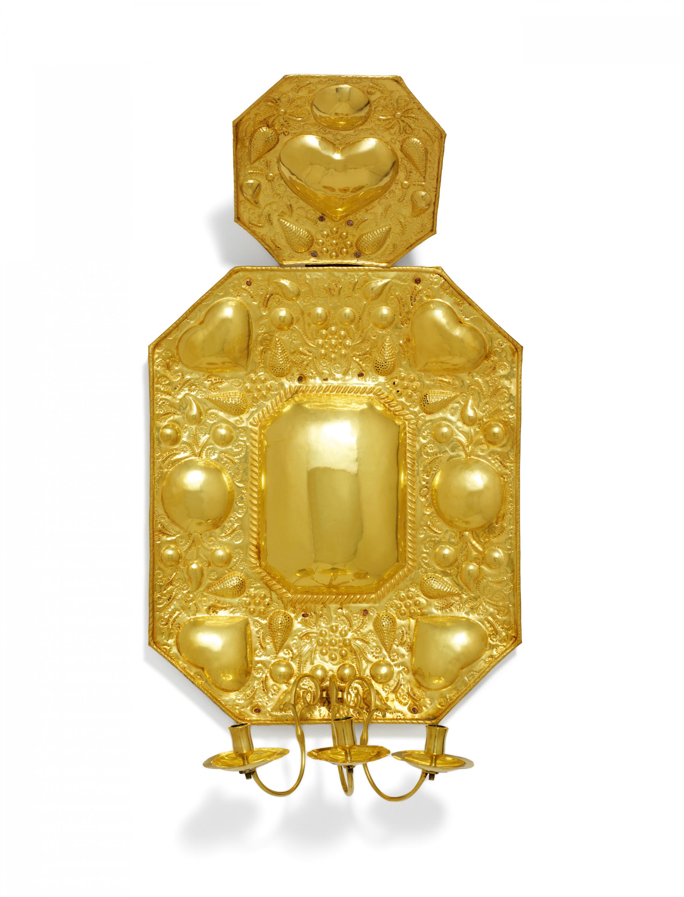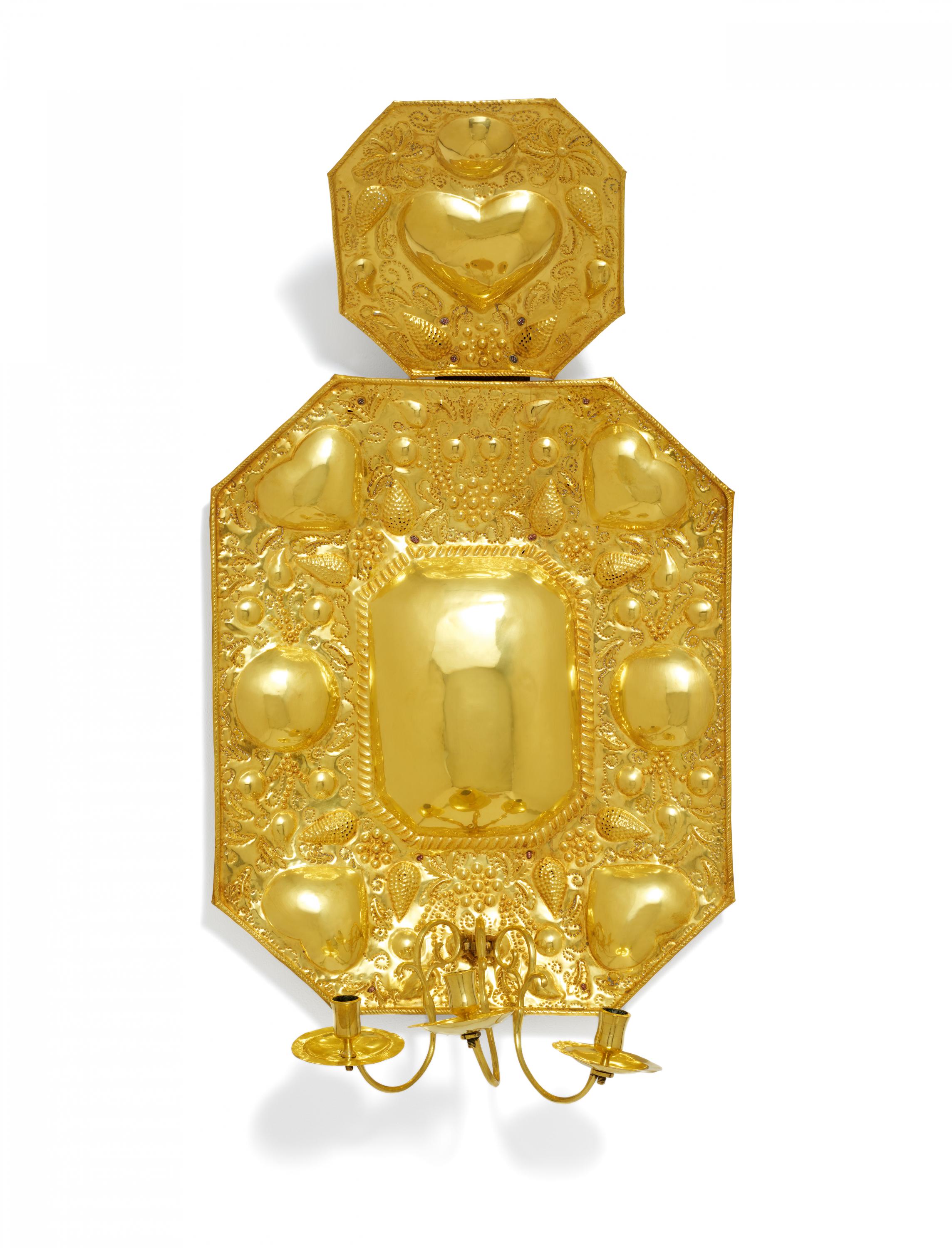 Hochrechteckige, oktogonale Form mit Trauben- und Herzmotiven. Unten je drei eingesteckte Leuchterarme. .