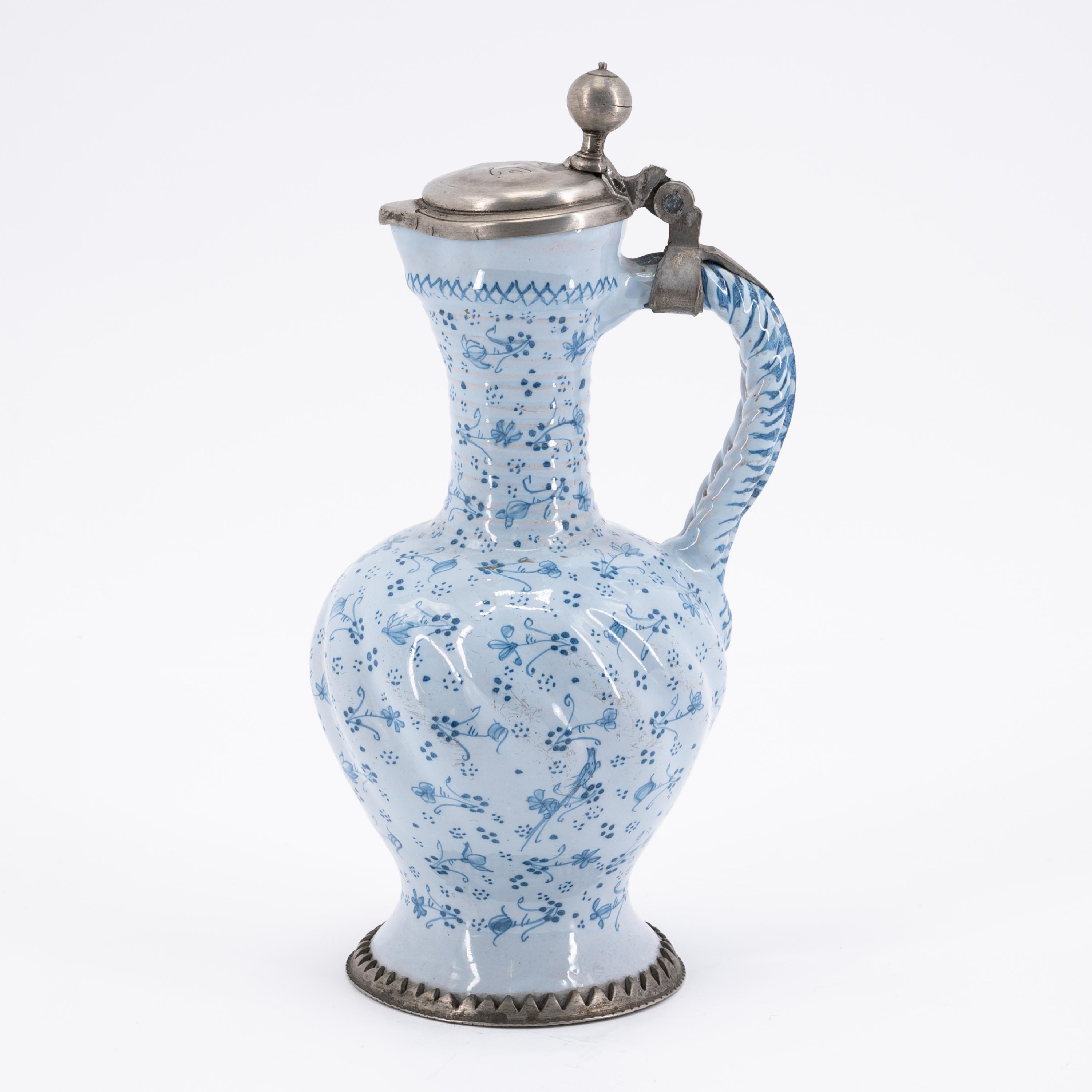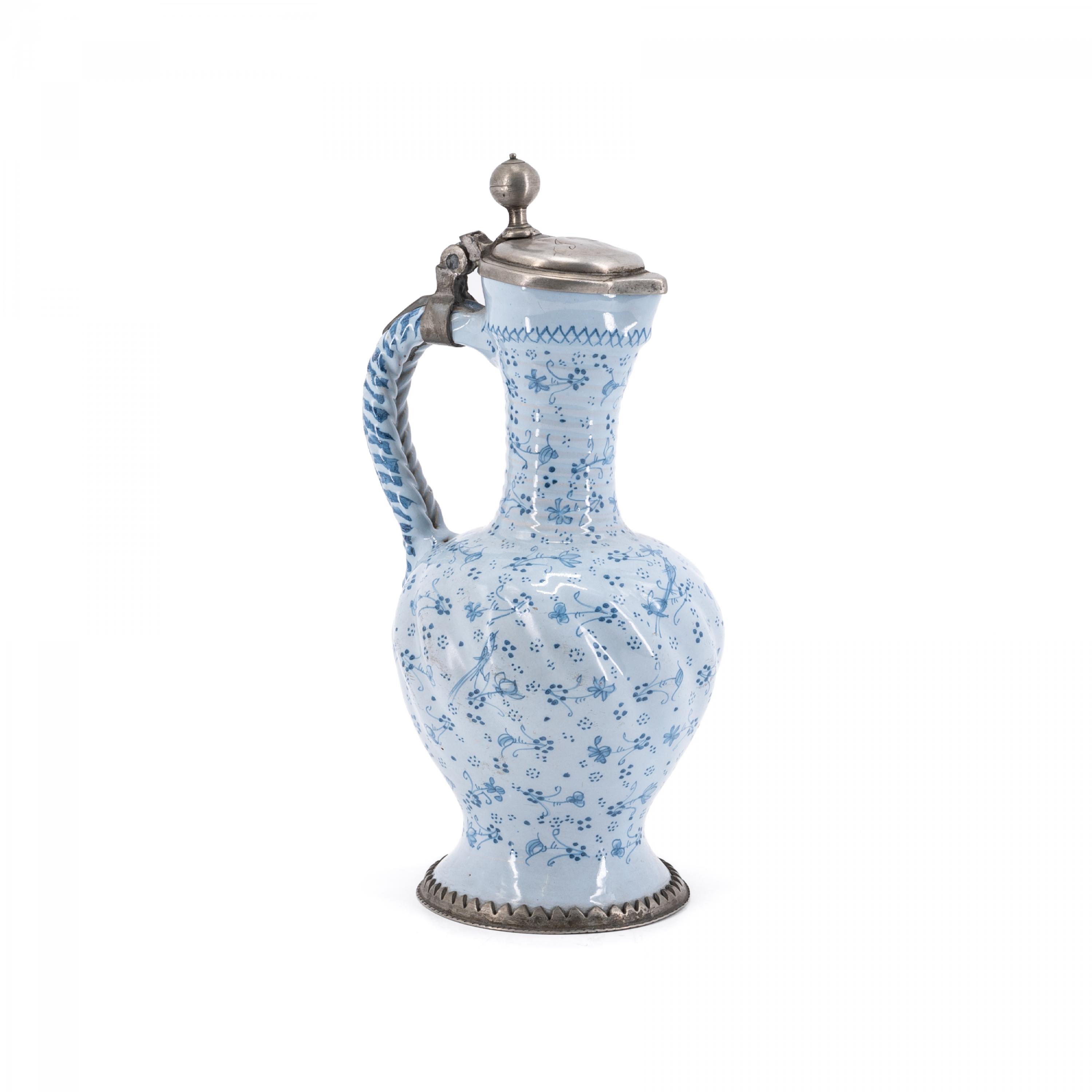 Technik: Beiger Scherben mit lichtblauer Glasur und blauem Dekor. Zinnmontierung.