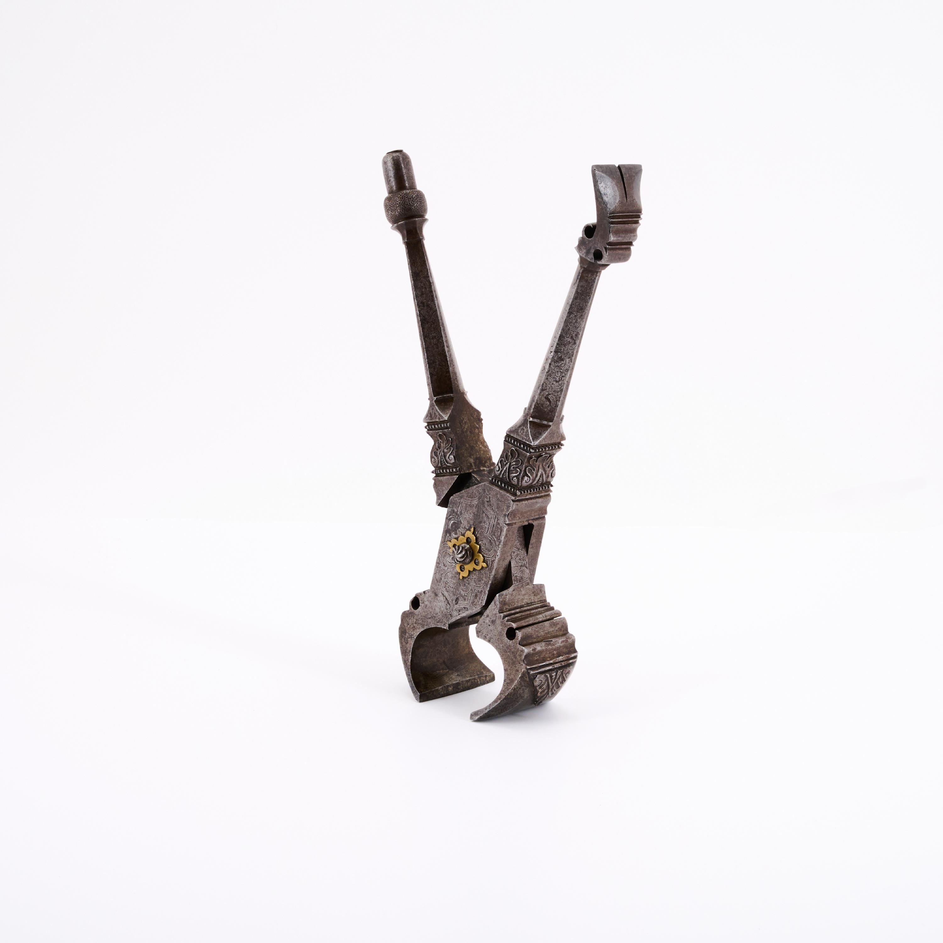 Beschreibung: Das aus zwei Teilen bestehende Werkzeug oben in Form einer Zange gearbeitet. Die massiven,