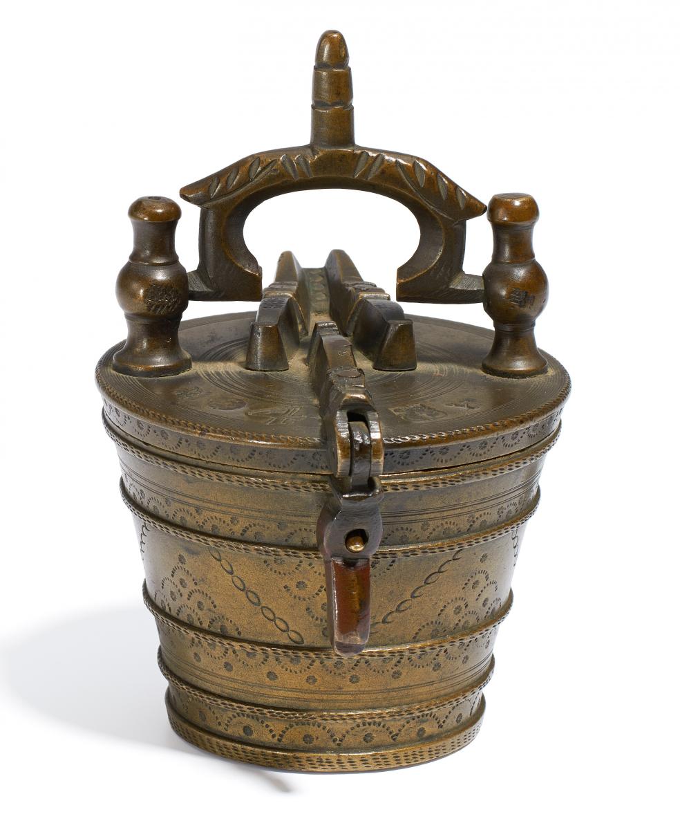 Bronze. Konische Wandung mit scharniertem Deckel. Sechs Einsätze. Gesamtgewicht ca. 1940g. Höhe 13cm.