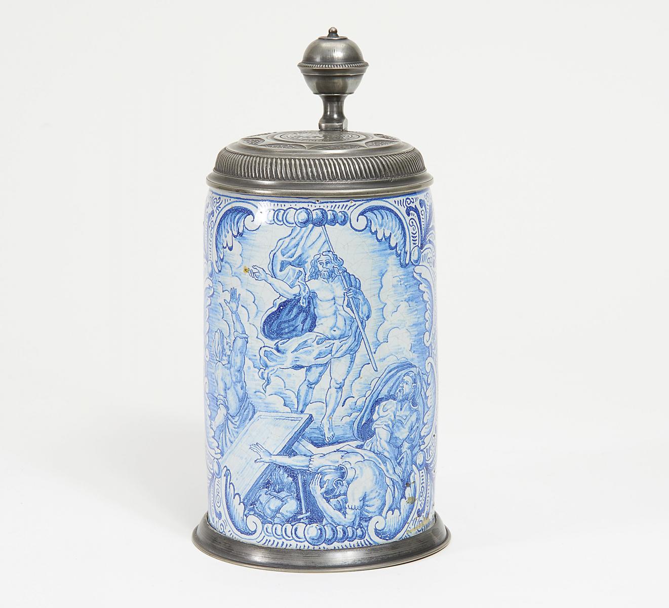 Technik: Keramik, weiße Glasur, blaues Dekor. Zinnmontierung.